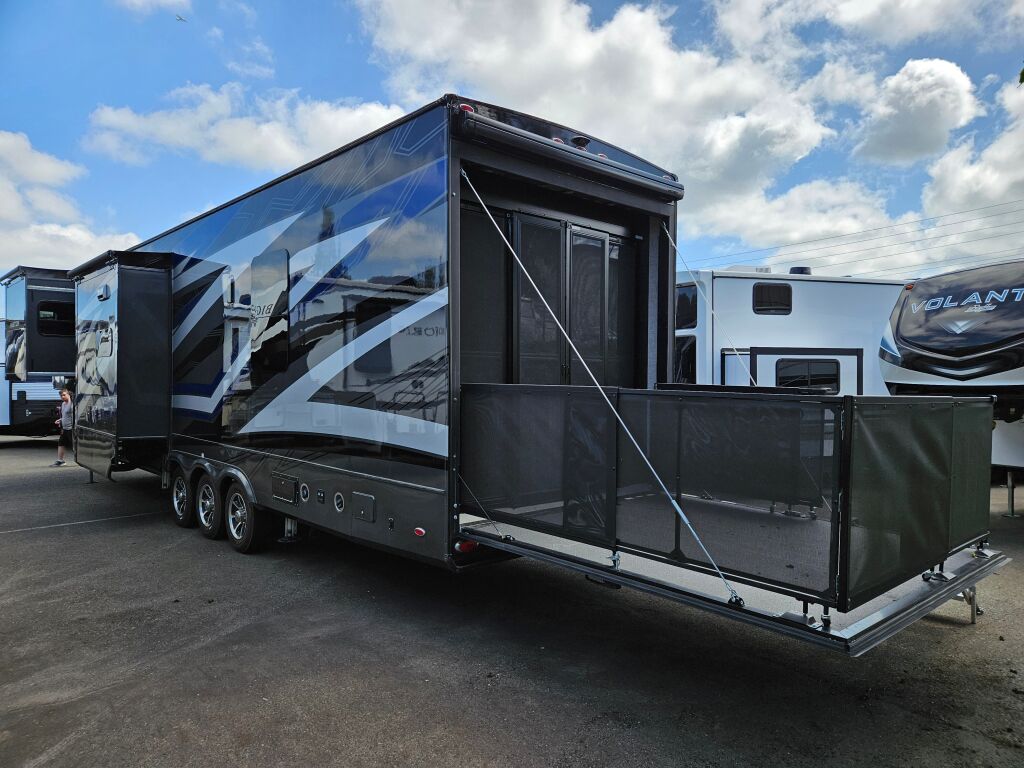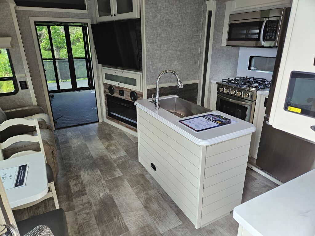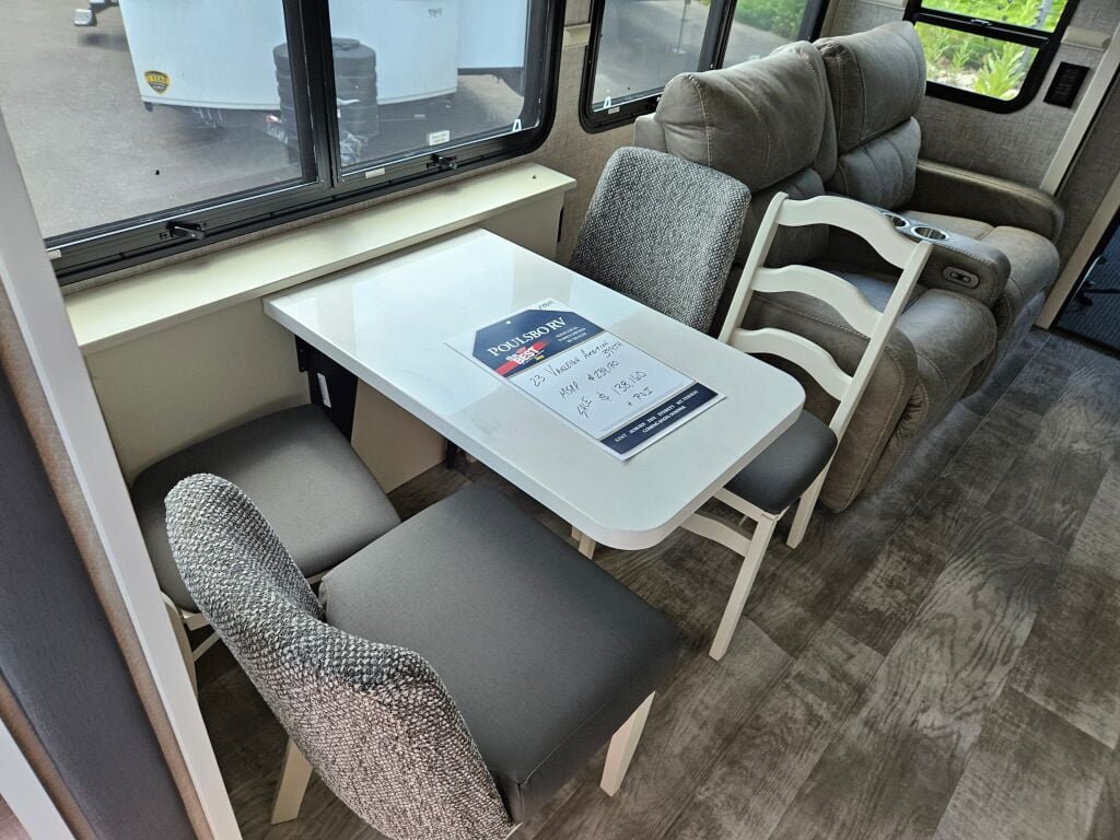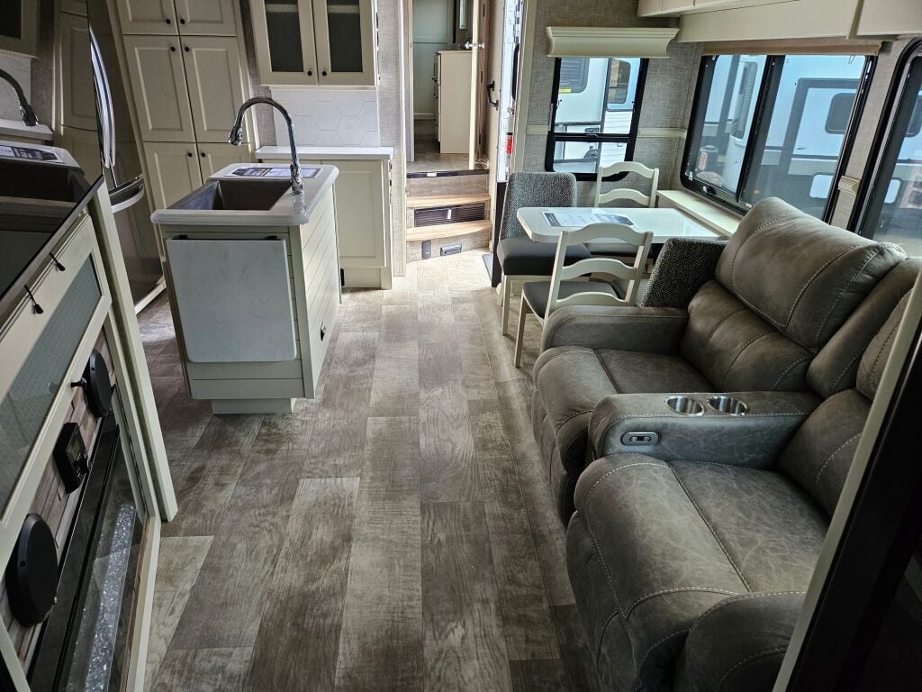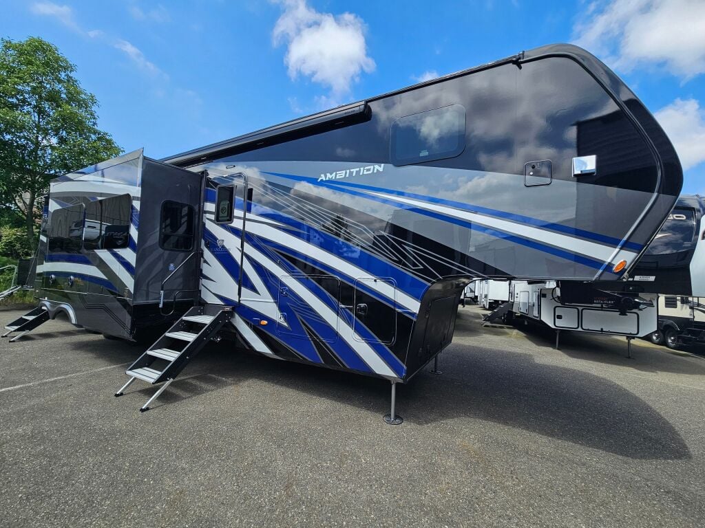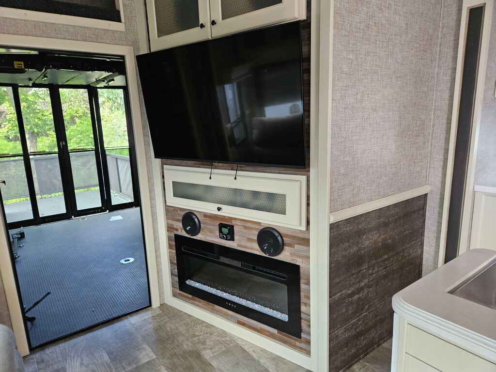 This 2023 Vanleigh Ambition 399TH Fifth Wheel has 3 slide outs, an HDTV above the electric fireplace, a sleeper sofa, theater seating and a table with free standing chairs for dining. The kitchen has a double bowl under mount sink, a stove top with an oven, a microwave and 3 door stainless steel refrigerator. At the mid section is a full bath with an enclosed shower. The bedroom has a walk around king bed with an HDTV and a mirrored closet. outside you will find find this Ambition has an HDTV, a ladder to the roof, leveling jacks, a power awning and lots of space for storage. Stock#K5804 | 2023 Vanleigh Ambition 399TH Fifth Wheel specifications below;