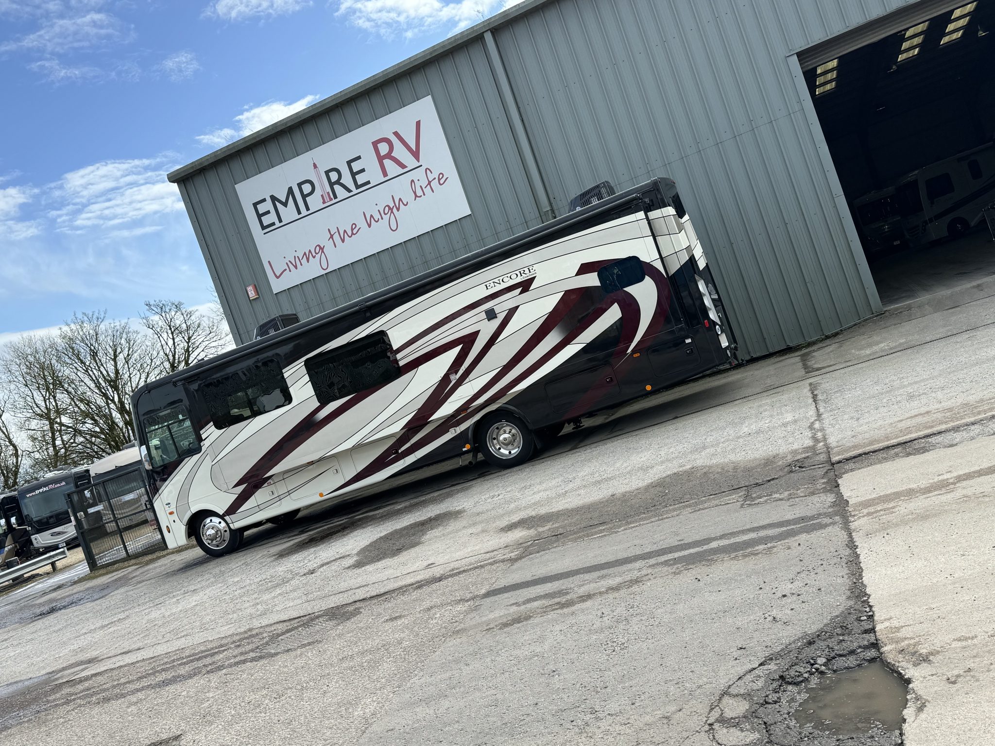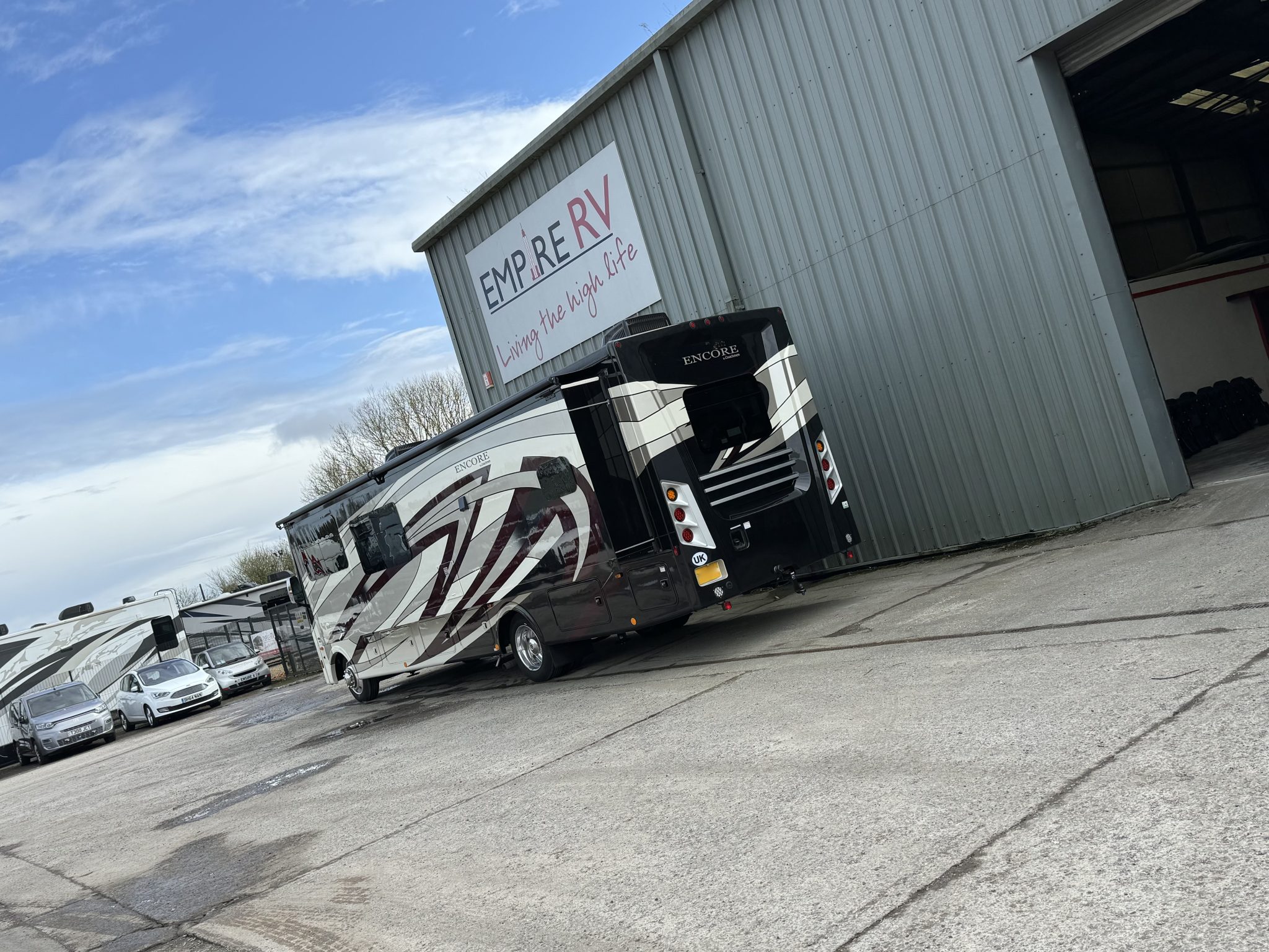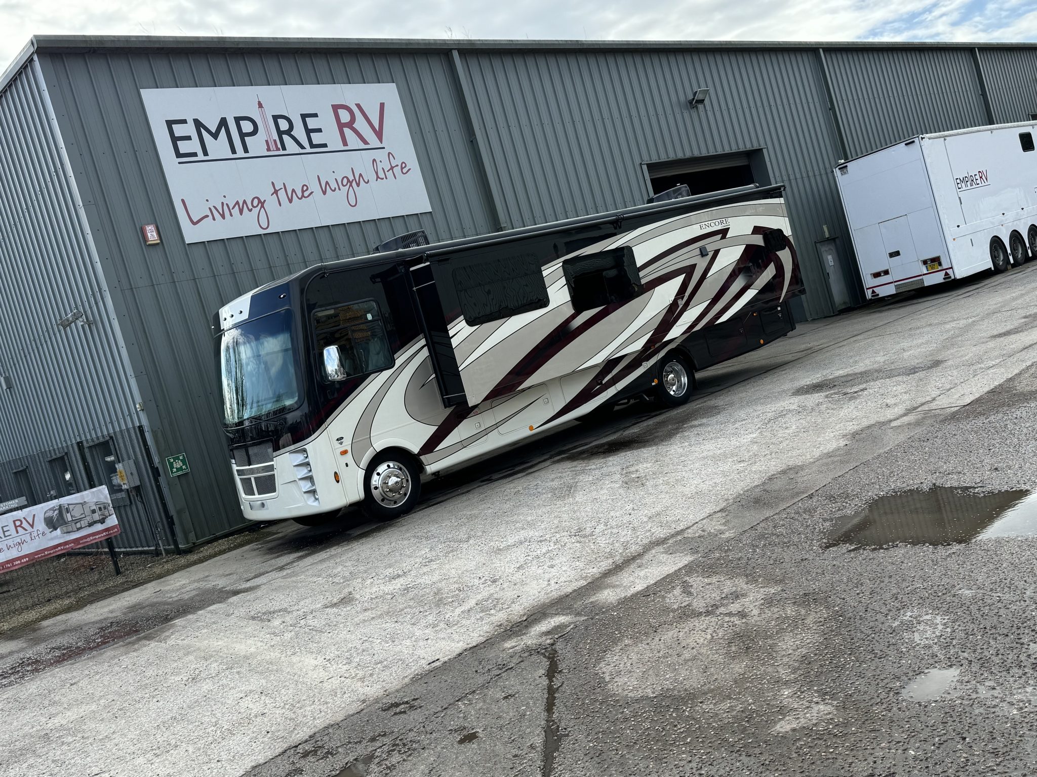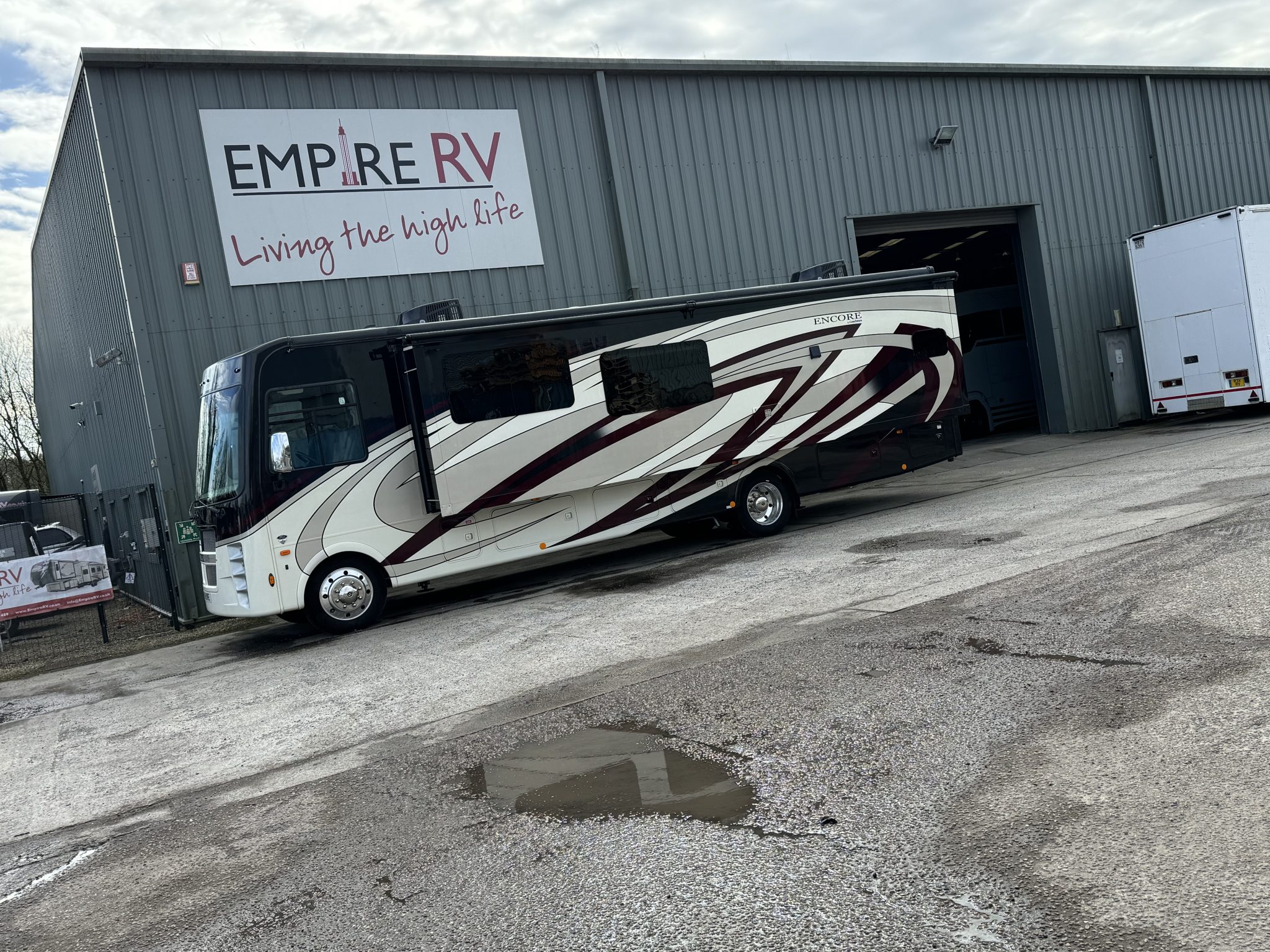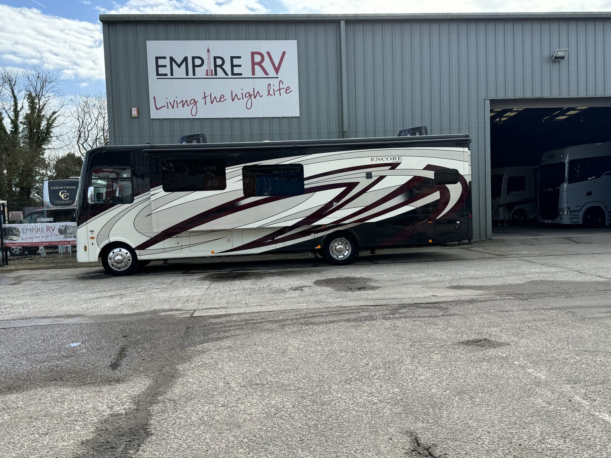 Here we have a beautiful as new Coachmen Encore 325SS with Caymus Full Body Paint, White Velvet Interior Wood Color, Powel Interior Decor, Full Wall slide-out, solar panels, illuminated awnings – 1 x 15′ and 1 x 10′, outside kitchen with fridge, outside TV, full-size domestic fridge freezer in the inside kitchen, washing machine & tumble dryer, rear fixed super-king size bed. drop down over-cab bunk bed, dinette also converts into a bed, Reclining/massaging cinema seating. Full size shower and porcelain toilet. Converted to run on LPG dual fuel. Alcoa Alloy Wheels with 255 x 22.5 Michelin tyres. Just 2,500 miles only! Available to view at our Somerset showroom.