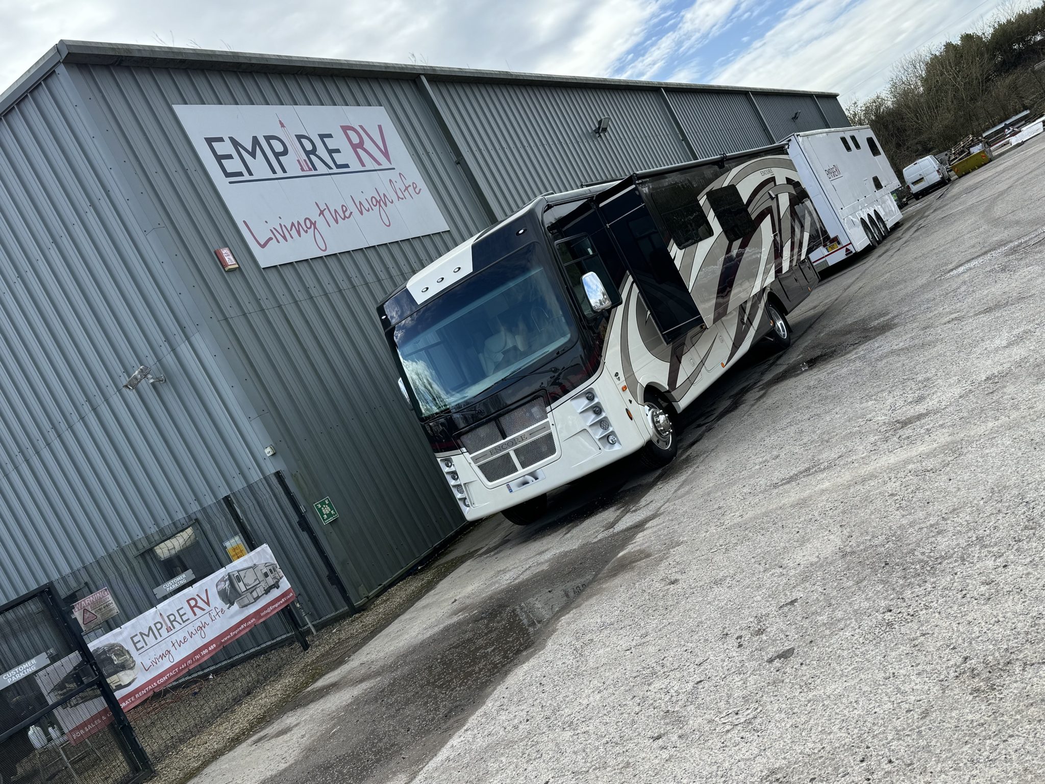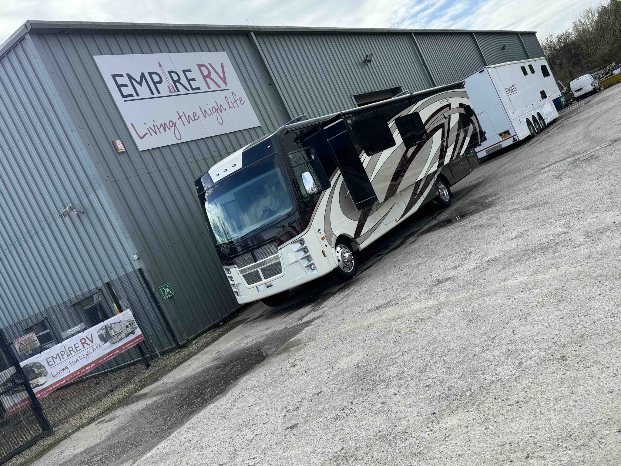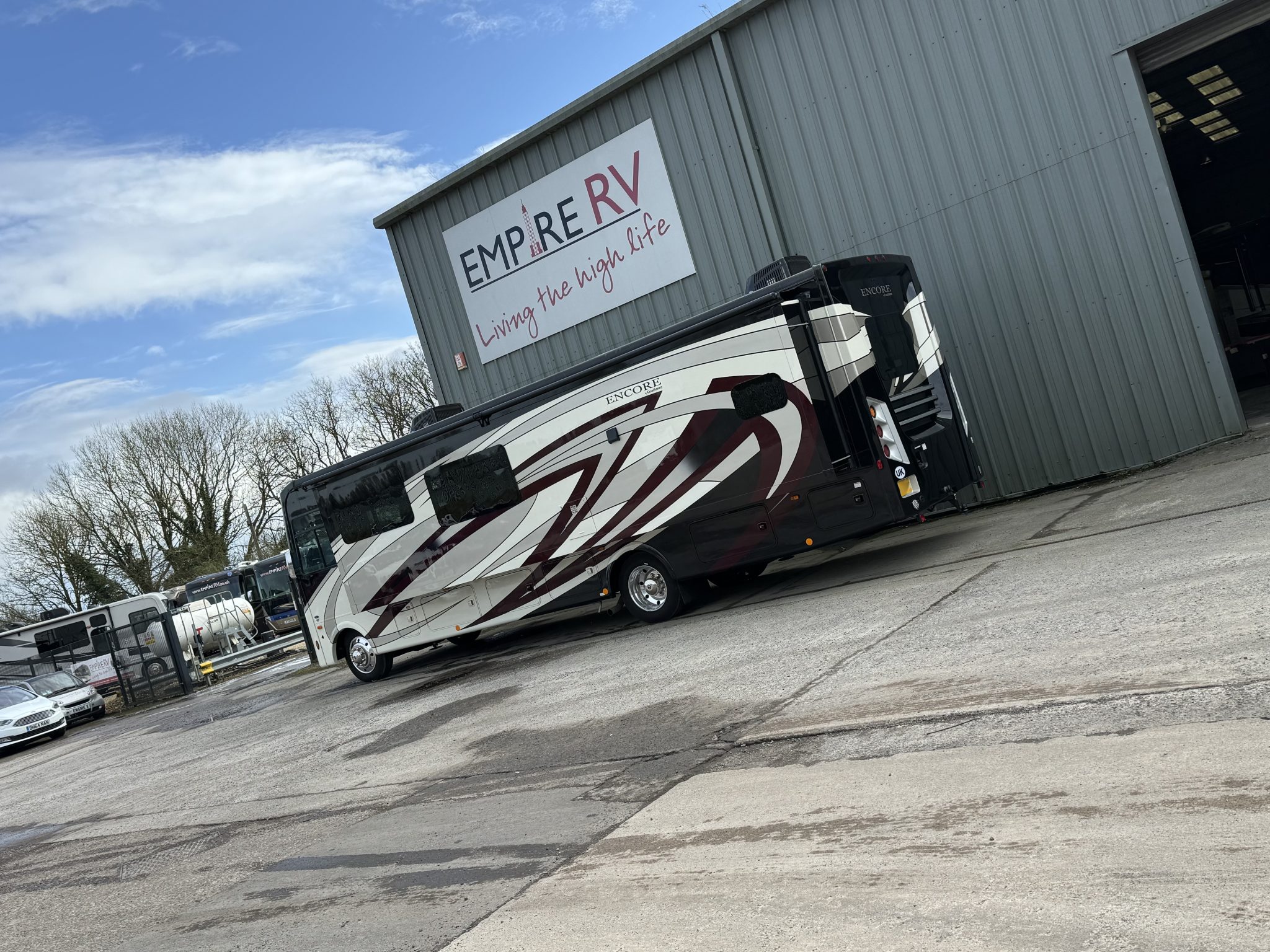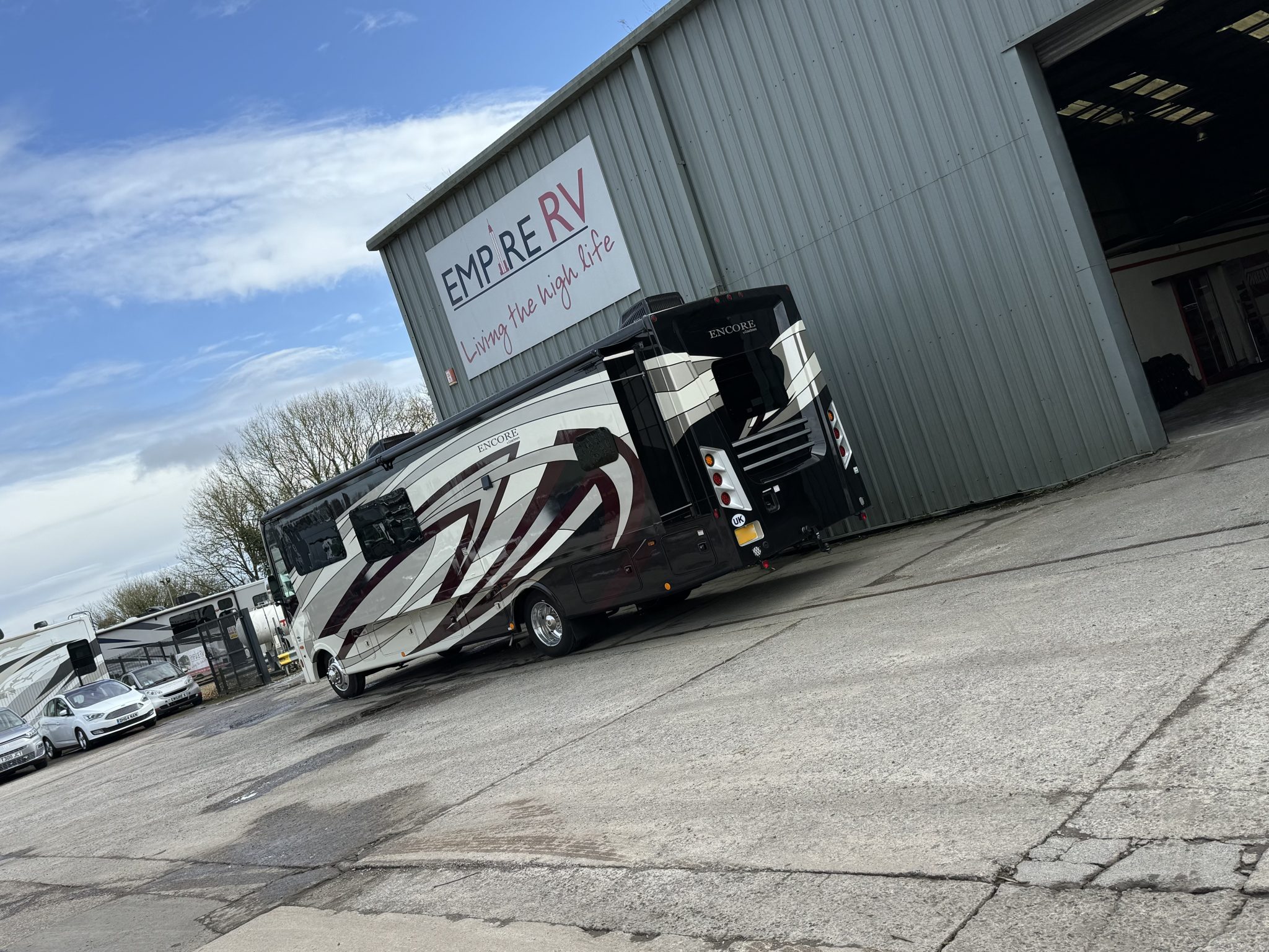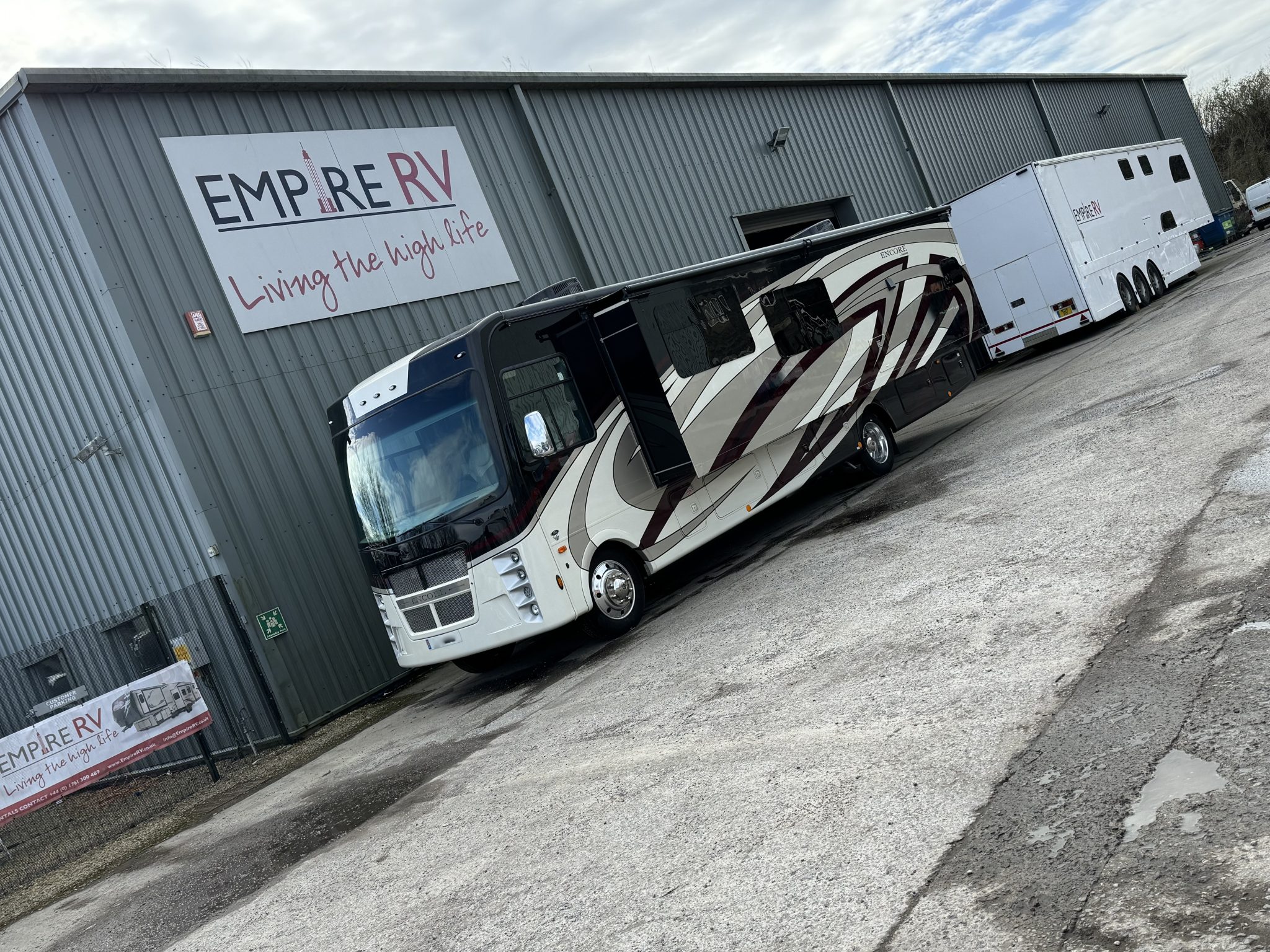 Here we have a beautiful as new Coachmen Encore 325SS with Caymus Full Body Paint, White Velvet Interior Wood Color, Powel Interior Decor, Full Wall slide-out, solar panels, illuminated awnings – 1 x 15′ and 1 x 10′, outside kitchen with fridge, outside TV, full-size domestic fridge freezer in the inside kitchen, washing machine & tumble dryer, rear fixed super-king size bed. drop down over-cab bunk bed, dinette also converts into a bed, Reclining/massaging cinema seating. Full size shower and porcelain toilet. Converted to run on LPG dual fuel. Alcoa Alloy Wheels with 255 x 22.5 Michelin tyres. Just 2,500 miles only! Available to view at our Somerset showroom.