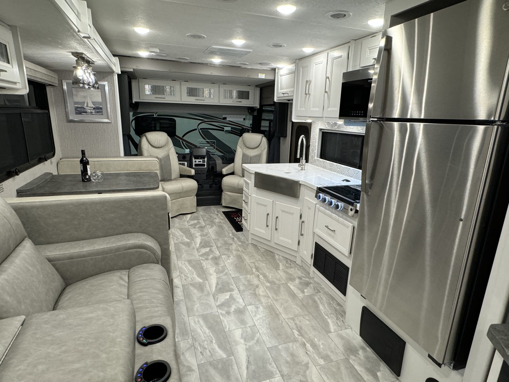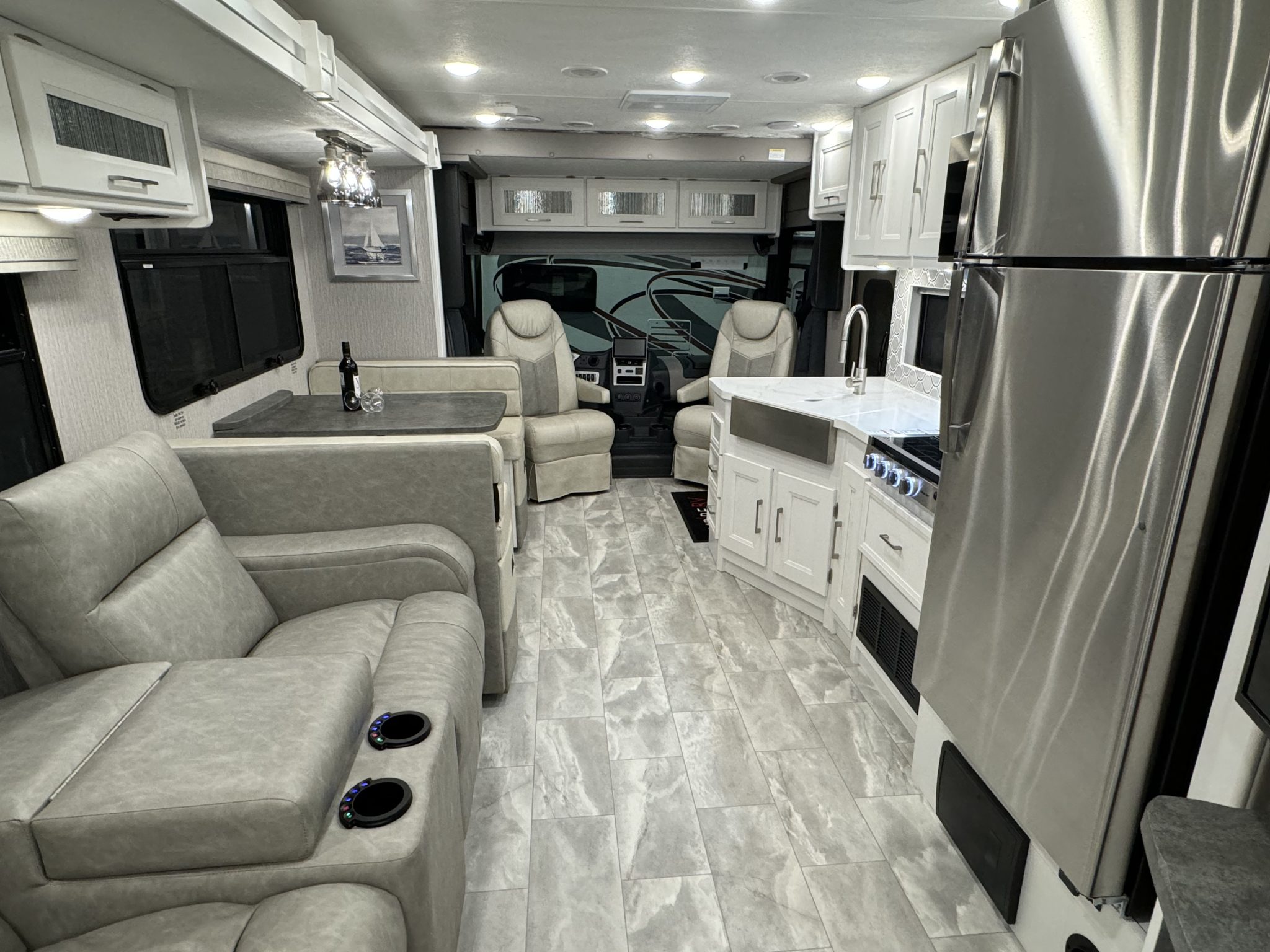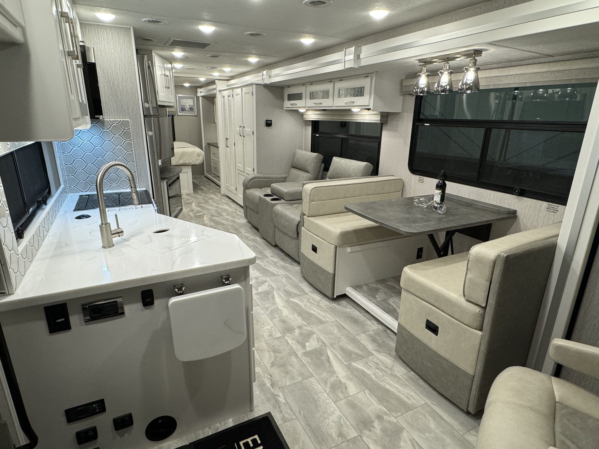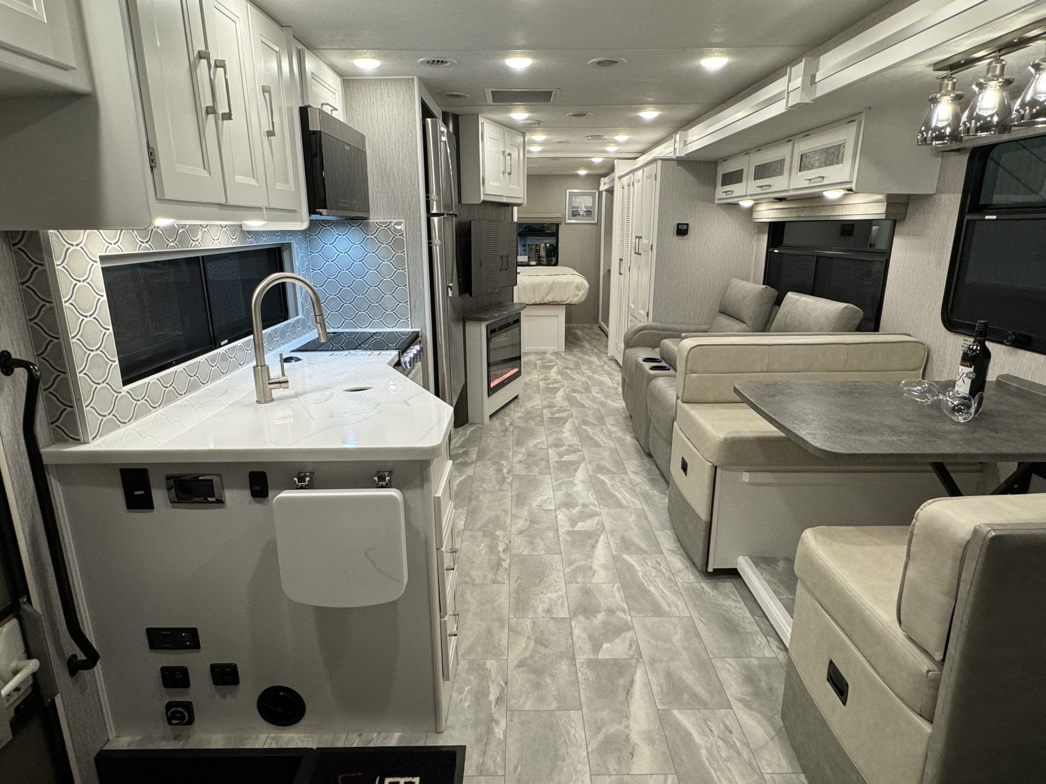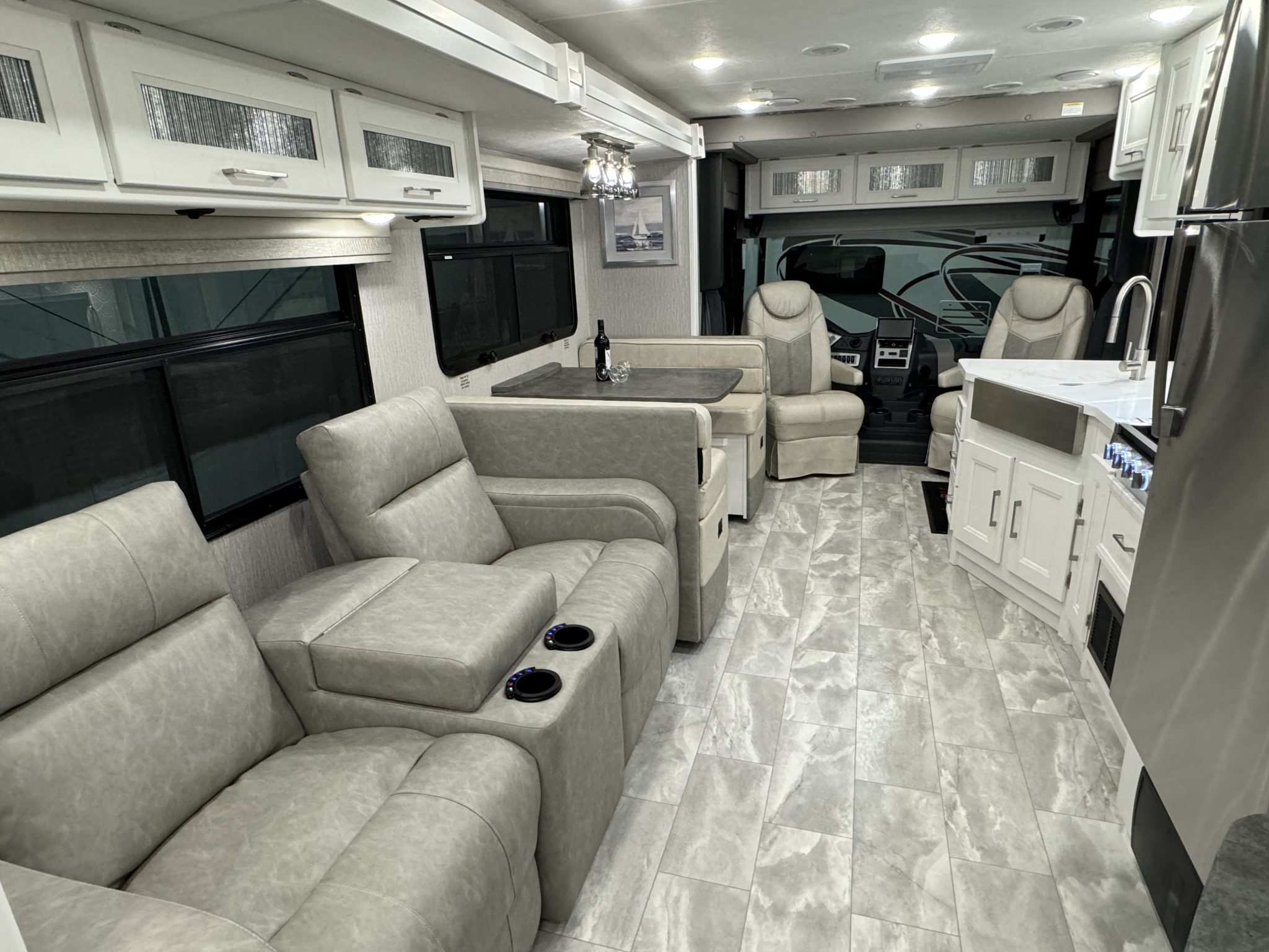 Here we have a beautiful as new Coachmen Encore 325SS with Caymus Full Body Paint, White Velvet Interior Wood Color, Powel Interior Decor, Full Wall slide-out, solar panels, illuminated awnings – 1 x 15′ and 1 x 10′, outside kitchen with fridge, outside TV, full-size domestic fridge freezer in the inside kitchen, washing machine & tumble dryer, rear fixed super-king size bed. drop down over-cab bunk bed, dinette also converts into a bed, Reclining/massaging cinema seating. Full size shower and porcelain toilet. Converted to run on LPG dual fuel. Alcoa Alloy Wheels with 255 x 22.5 Michelin tyres. Just 2,500 miles only! Available to view at our Somerset showroom.