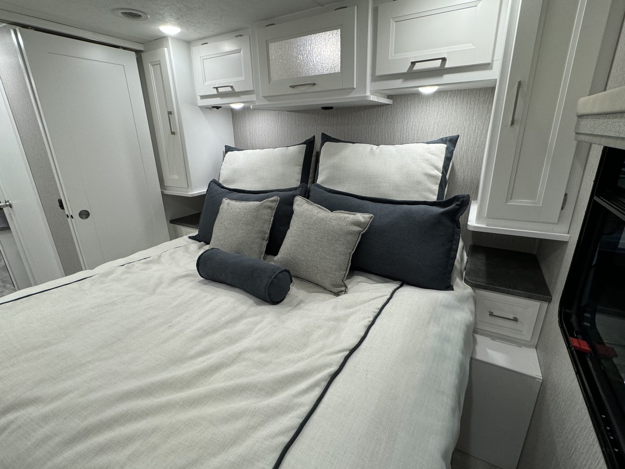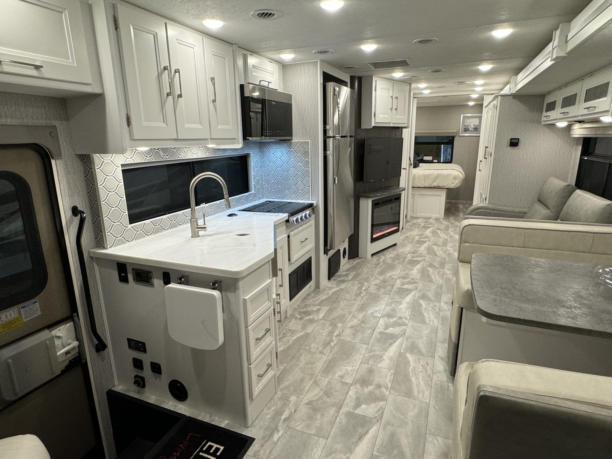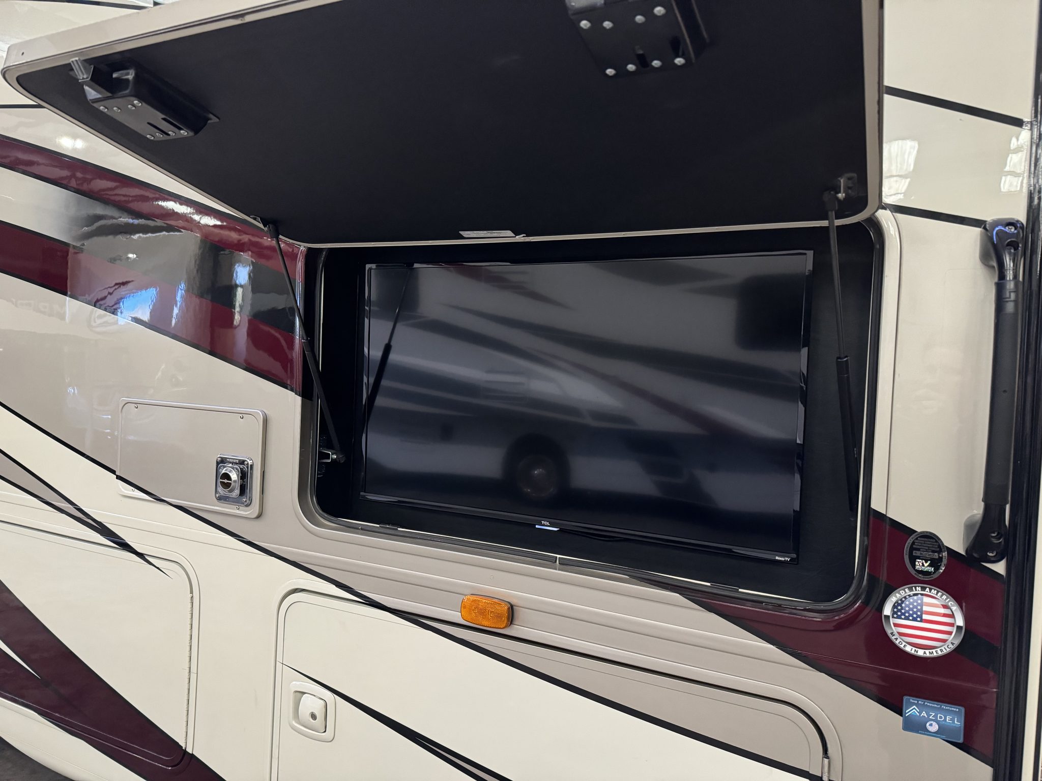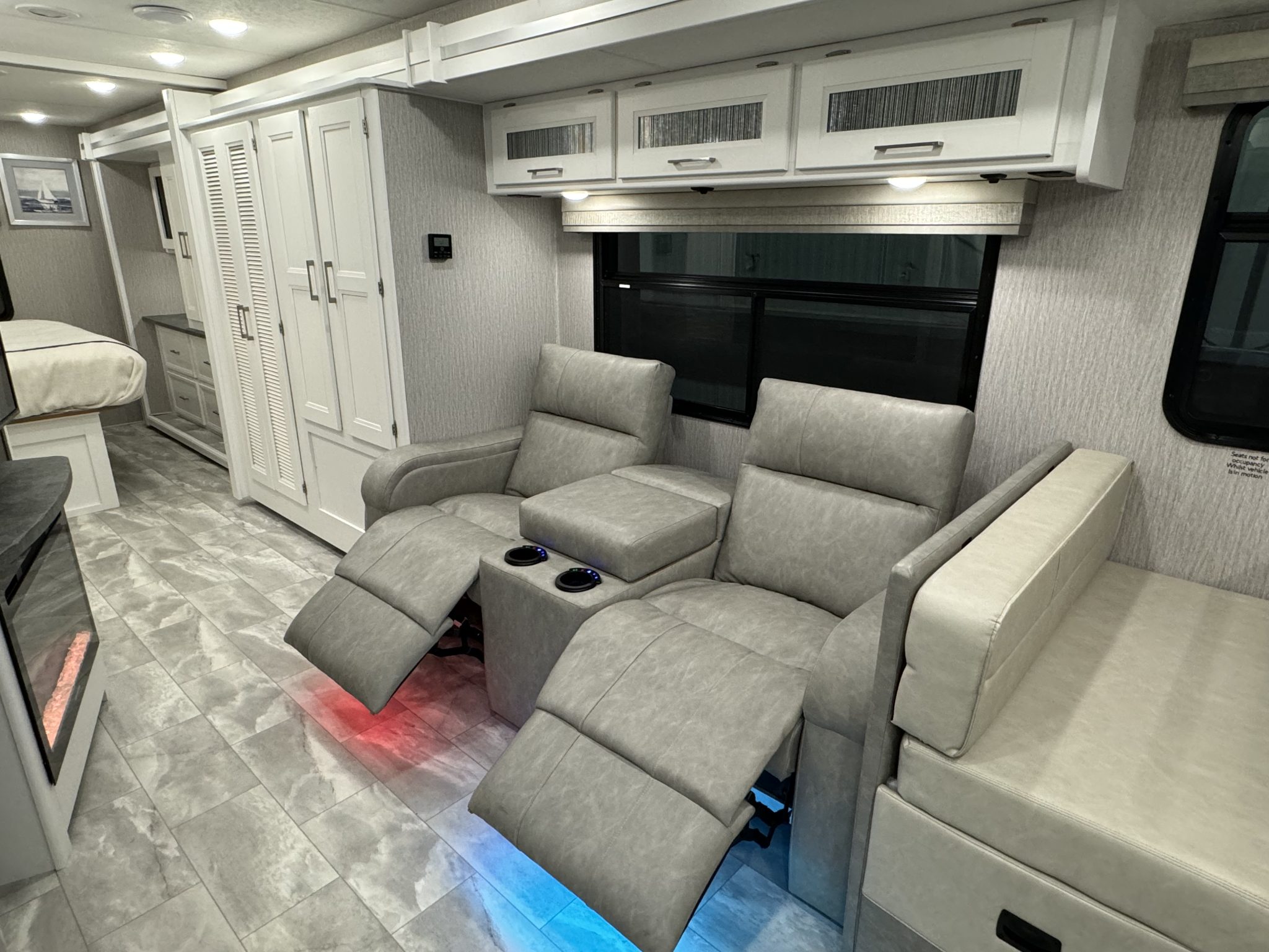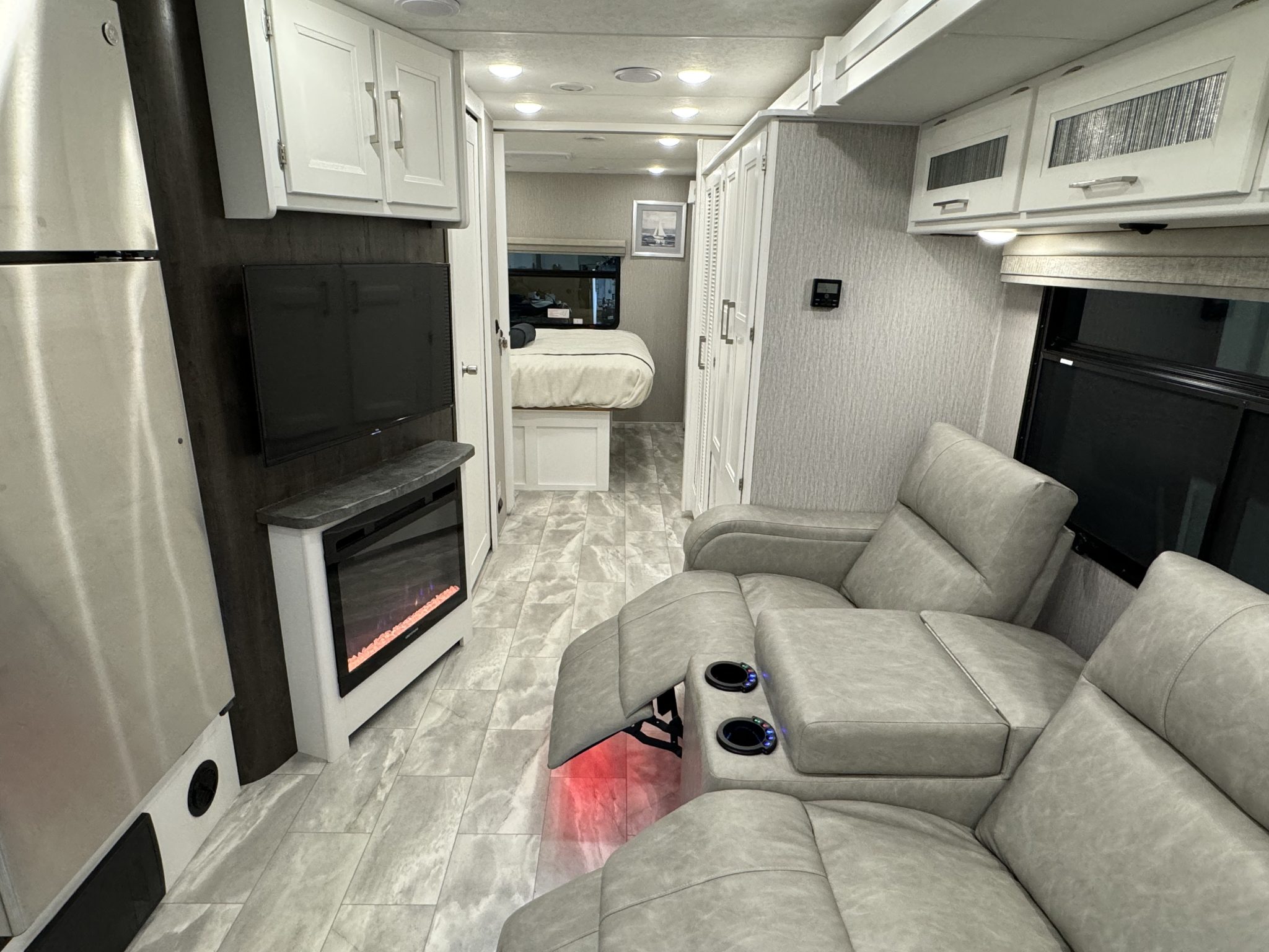 Here we have a beautiful as new Coachmen Encore 325SS with Caymus Full Body Paint, White Velvet Interior Wood Color, Powel Interior Decor, Full Wall slide-out, solar panels, illuminated awnings – 1 x 15′ and 1 x 10′, outside kitchen with fridge, outside TV, full-size domestic fridge freezer in the inside kitchen, washing machine & tumble dryer, rear fixed super-king size bed. drop down over-cab bunk bed, dinette also converts into a bed, Reclining/massaging cinema seating. Full size shower and porcelain toilet. Converted to run on LPG dual fuel. Alcoa Alloy Wheels with 255 x 22.5 Michelin tyres. Just 2,500 miles only! Available to view at our Somerset showroom.