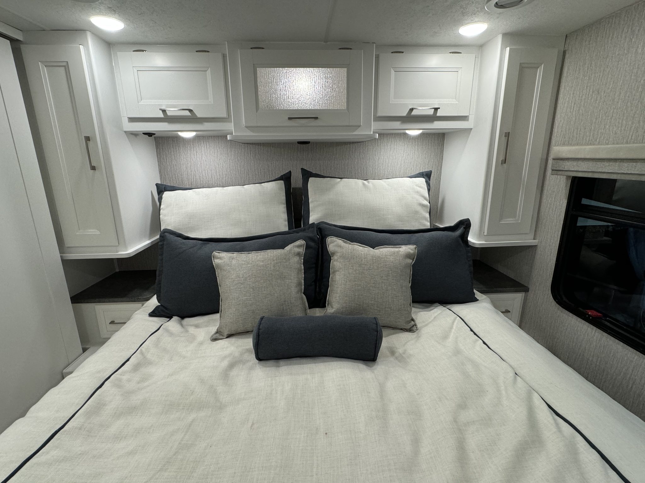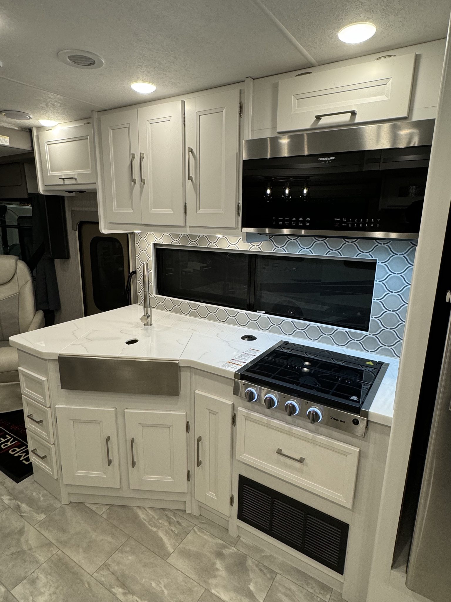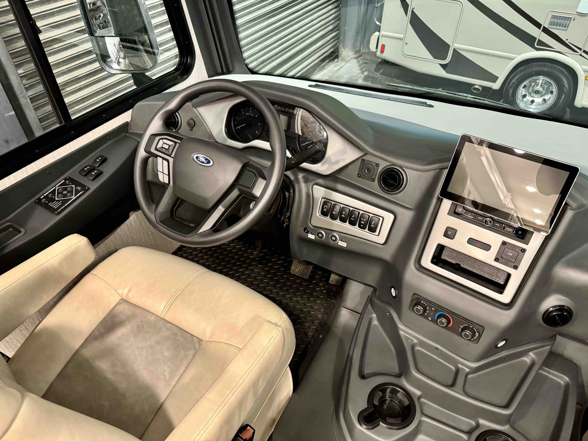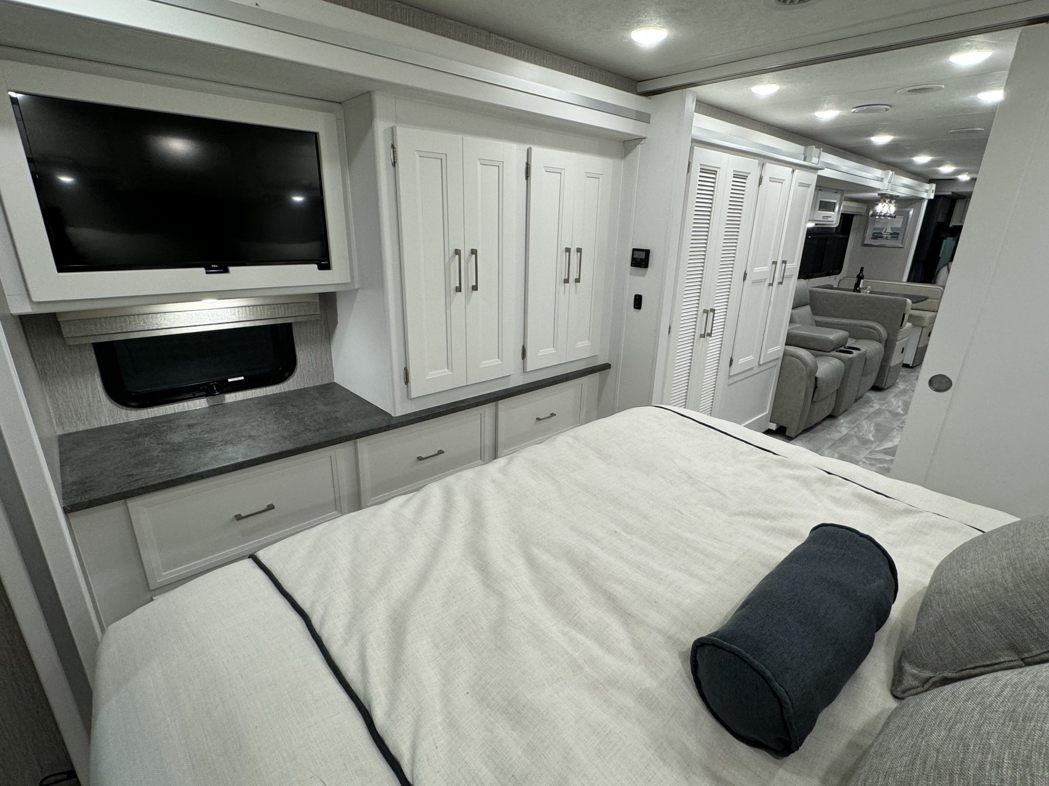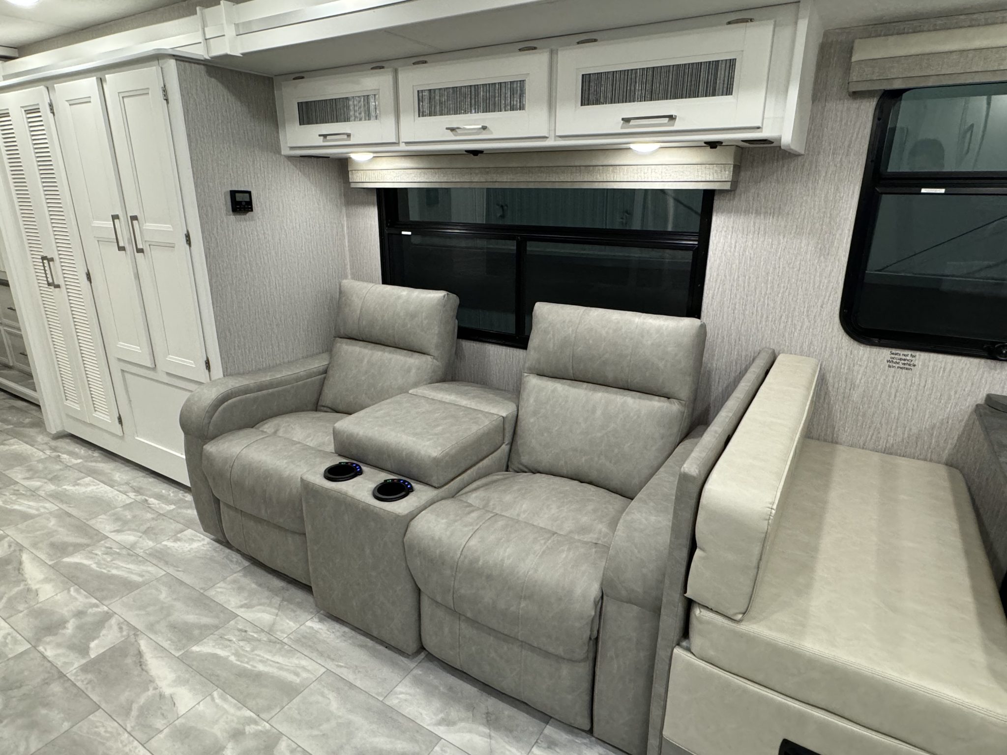 Here we have a beautiful as new Coachmen Encore 325SS with Caymus Full Body Paint, White Velvet Interior Wood Color, Powel Interior Decor, Full Wall slide-out, solar panels, illuminated awnings – 1 x 15′ and 1 x 10′, outside kitchen with fridge, outside TV, full-size domestic fridge freezer in the inside kitchen, washing machine & tumble dryer, rear fixed super-king size bed. drop down over-cab bunk bed, dinette also converts into a bed, Reclining/massaging cinema seating. Full size shower and porcelain toilet. Converted to run on LPG dual fuel. Alcoa Alloy Wheels with 255 x 22.5 Michelin tyres. Just 2,500 miles only! Available to view at our Somerset showroom.