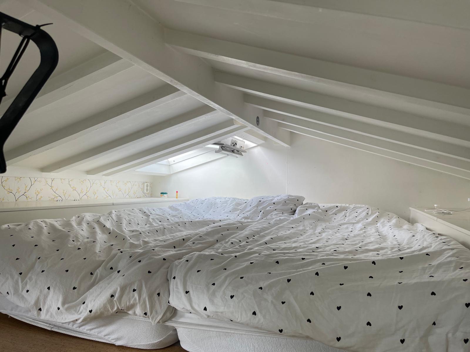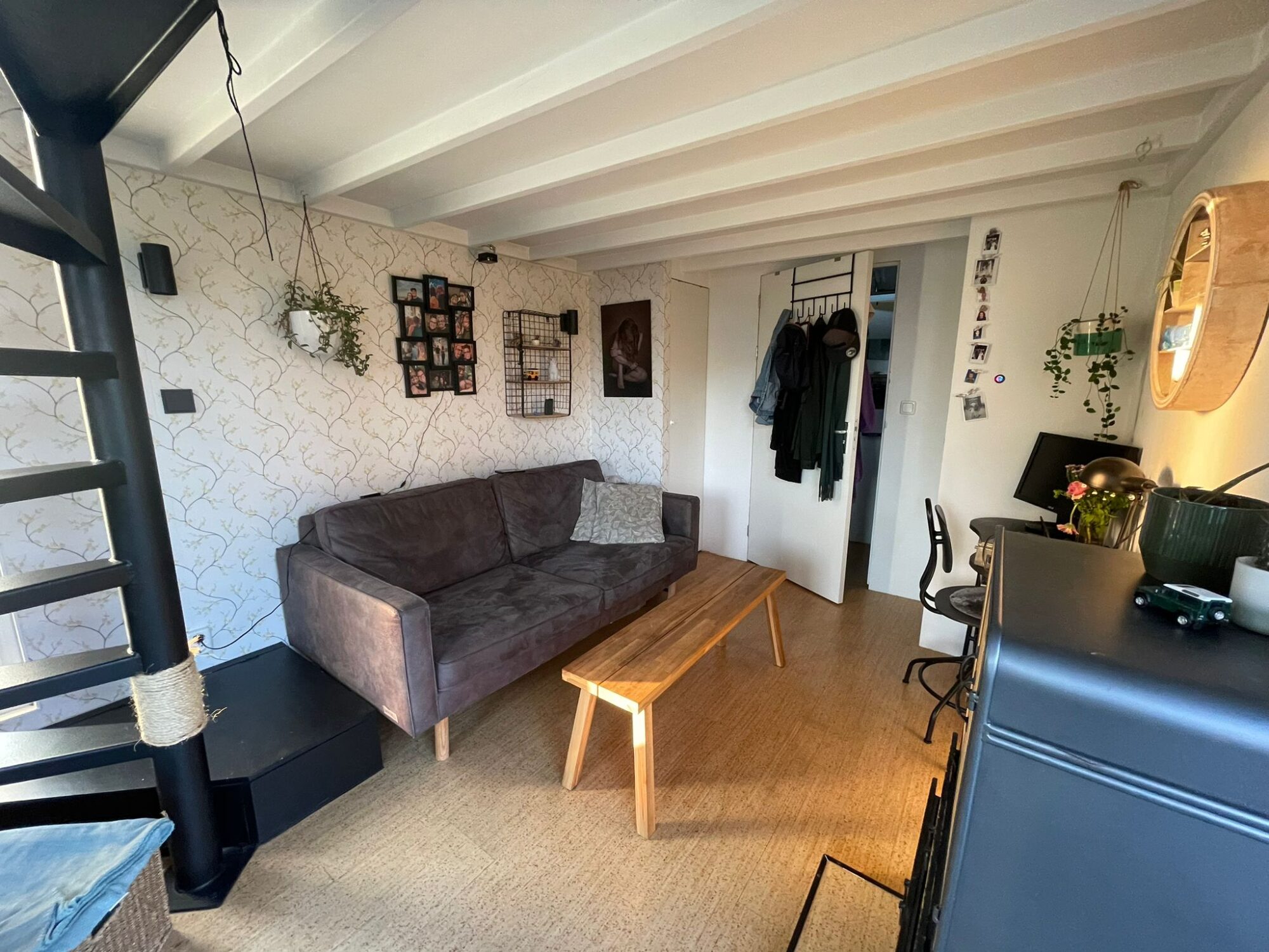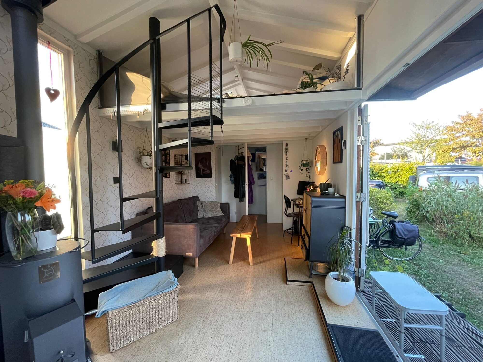 Sleeping loft with steel spiral staircase & under-bed storage