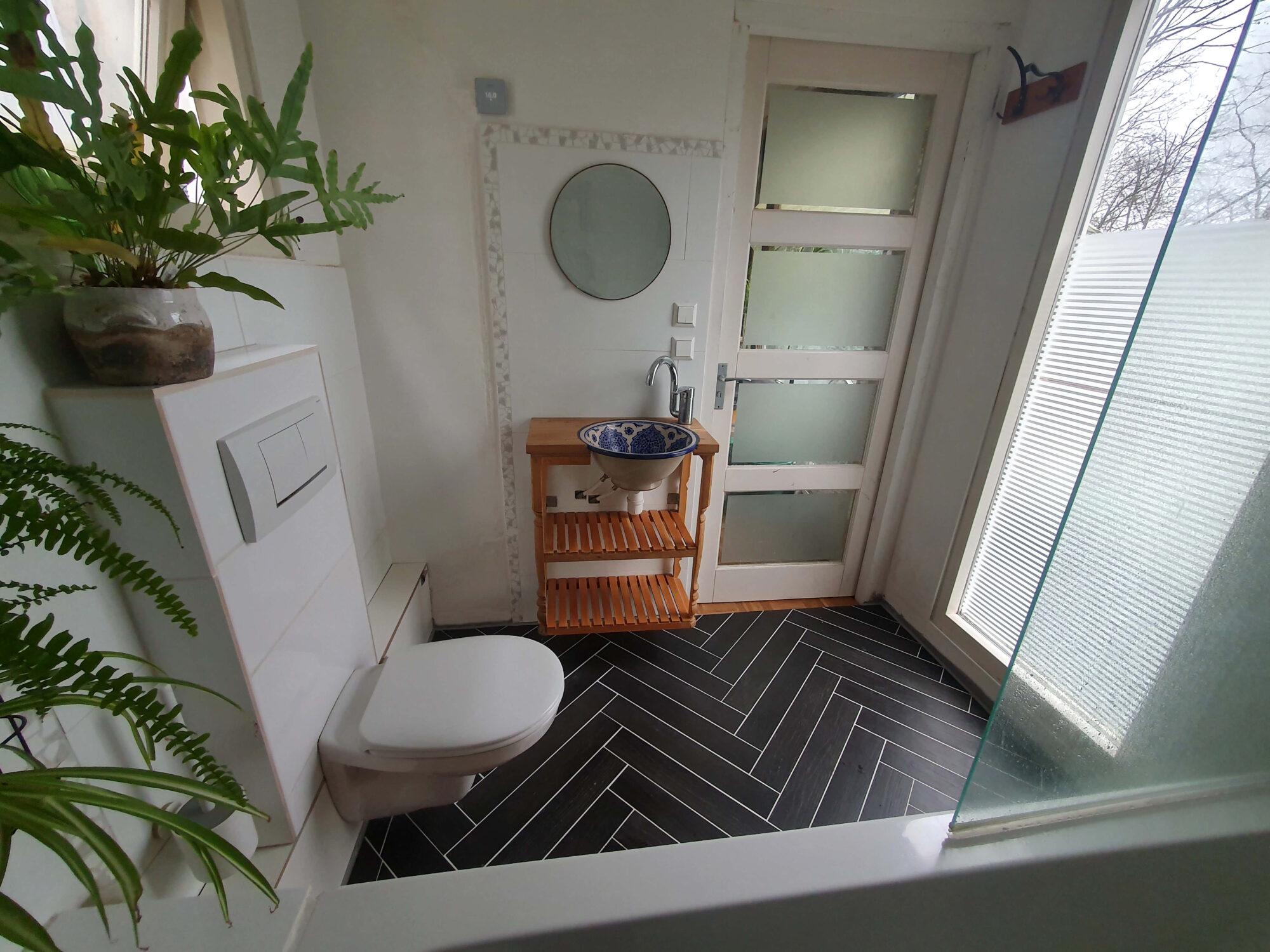 • The bathroom vanity features a ceramic basin carried hitchhiking from Morocco