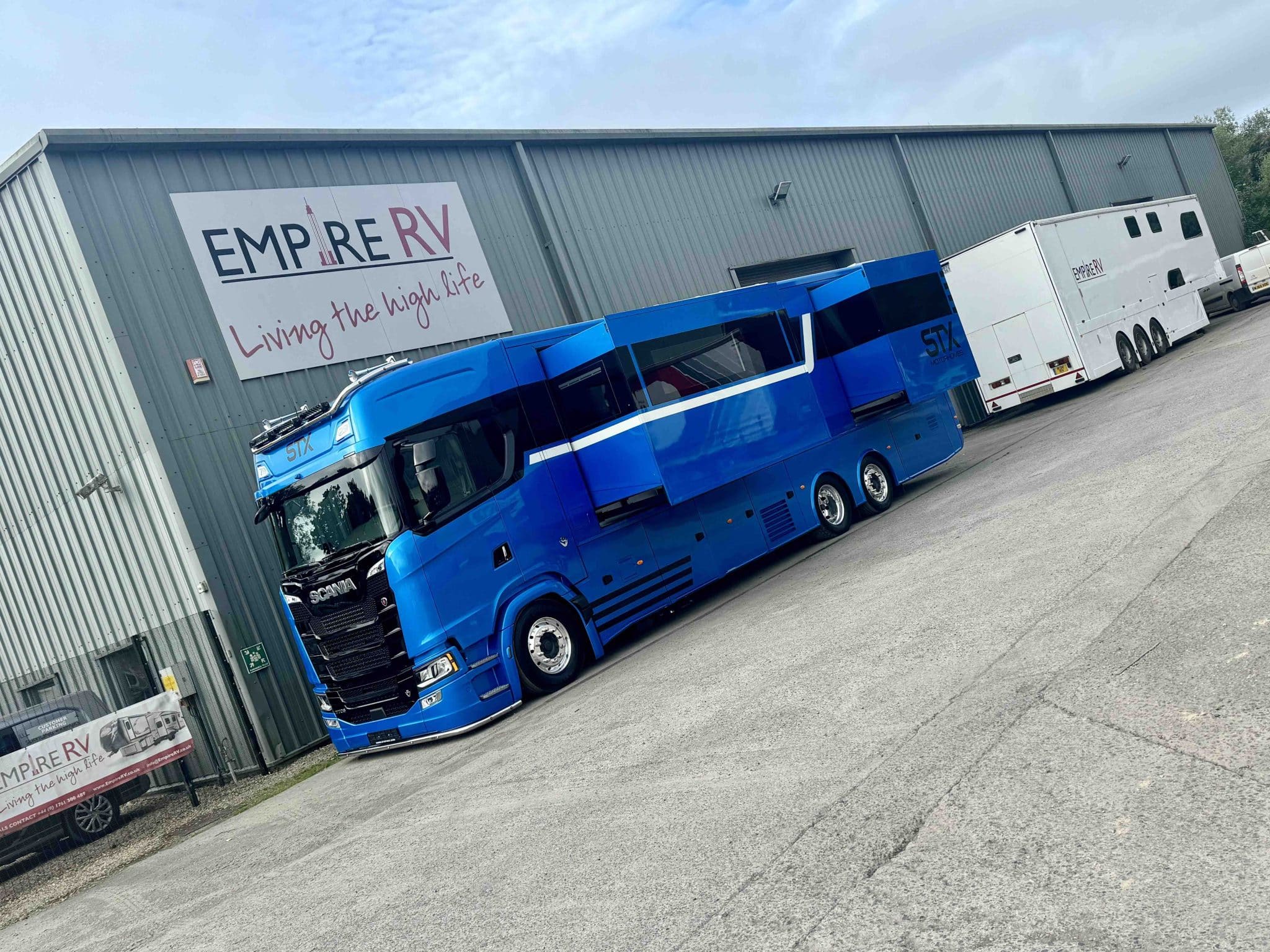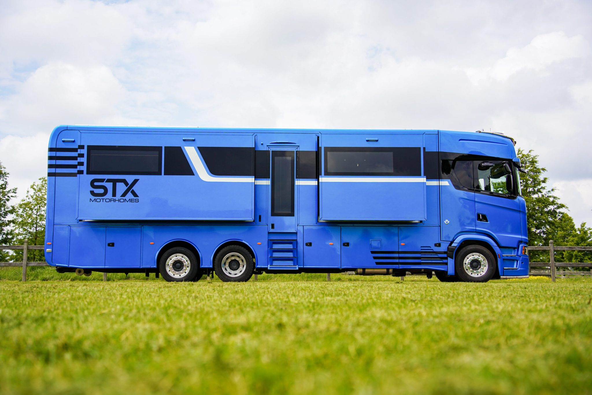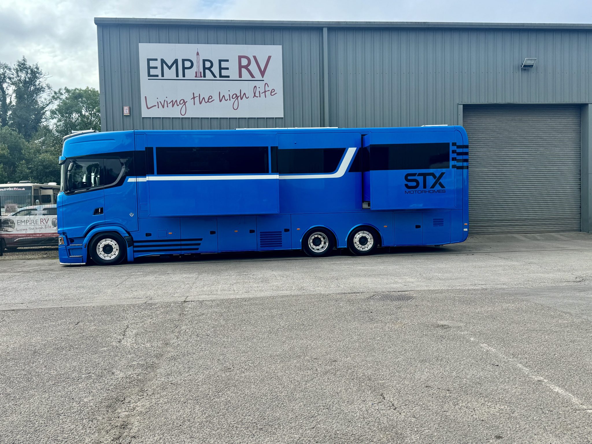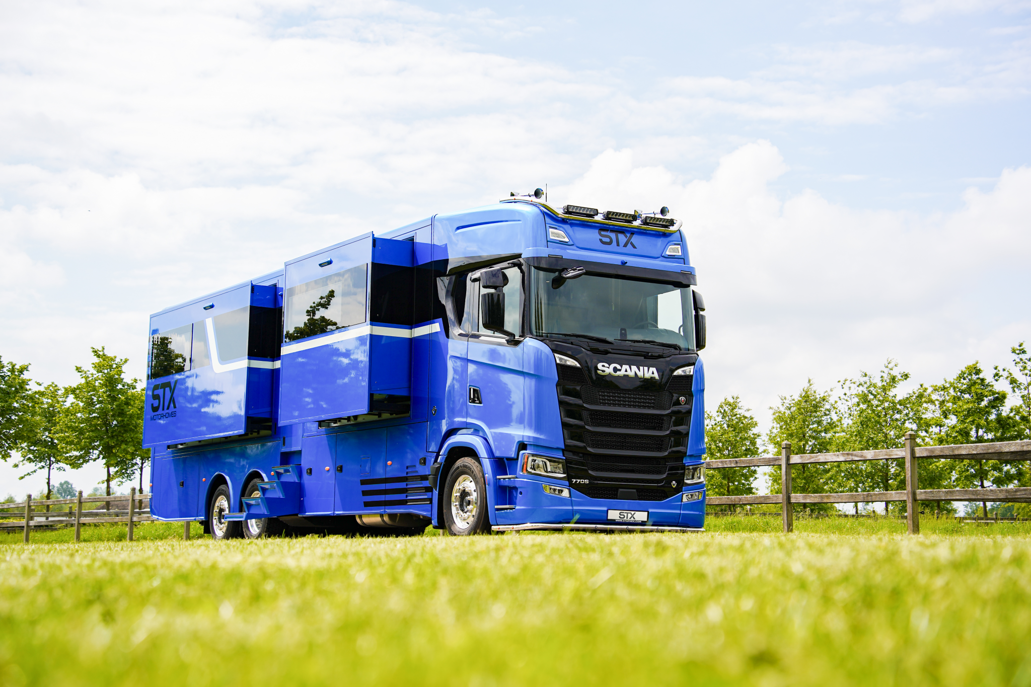 Here we have a beautiful 4 Pop Out STX Motorhome built on a Scania 770 Chassis and finished with a eye catching Alpine Blue exterior. This prestige STX Motorhome offers you a very versatile floorplan as it is one of only two STX Motorhomes built with bunks thus making it an 8 berth with a high end luxurious finish and is in stock ready to go.