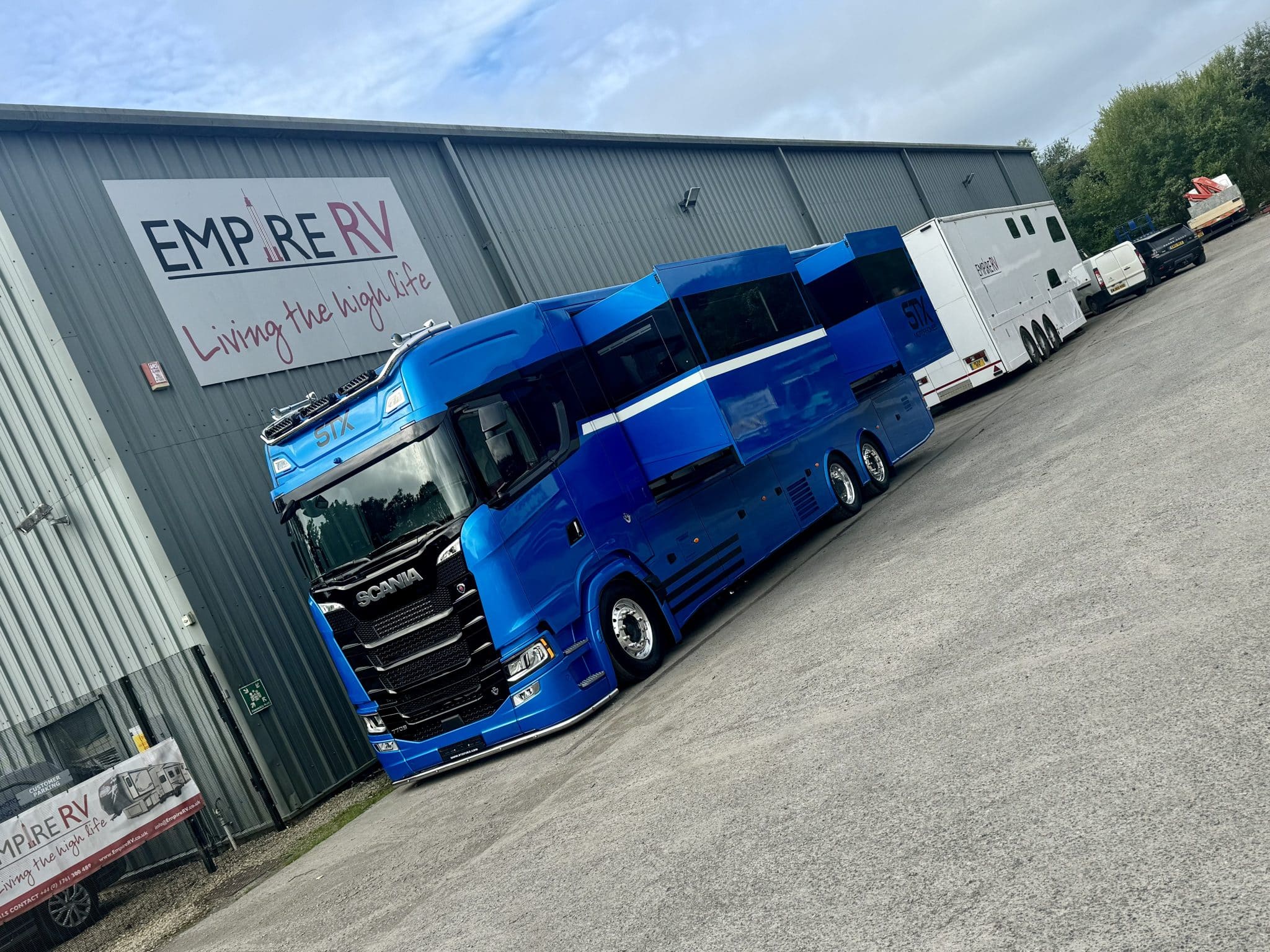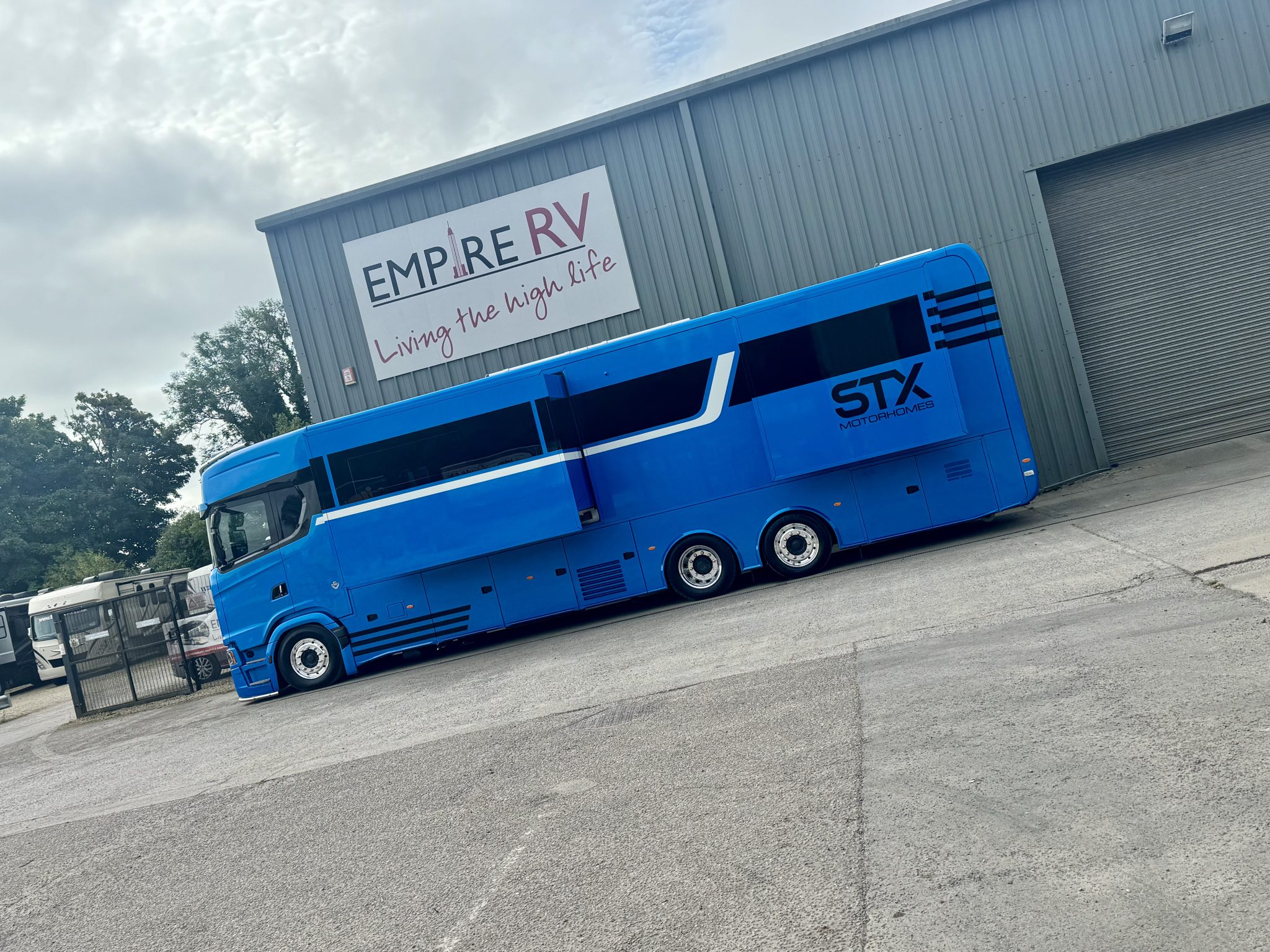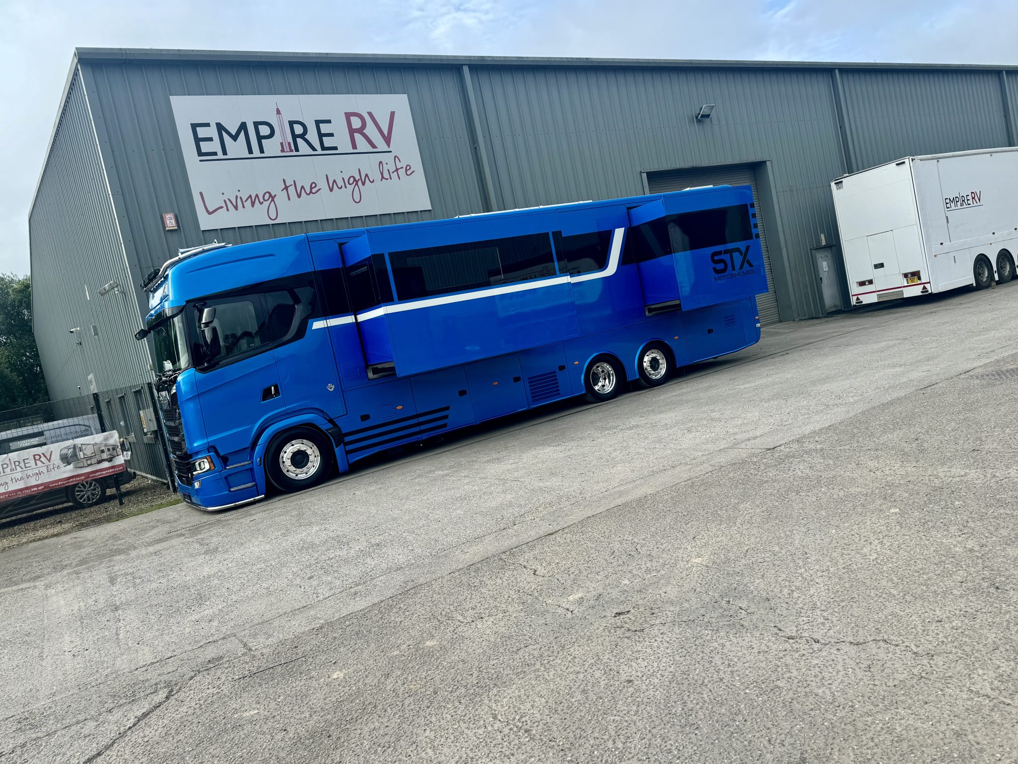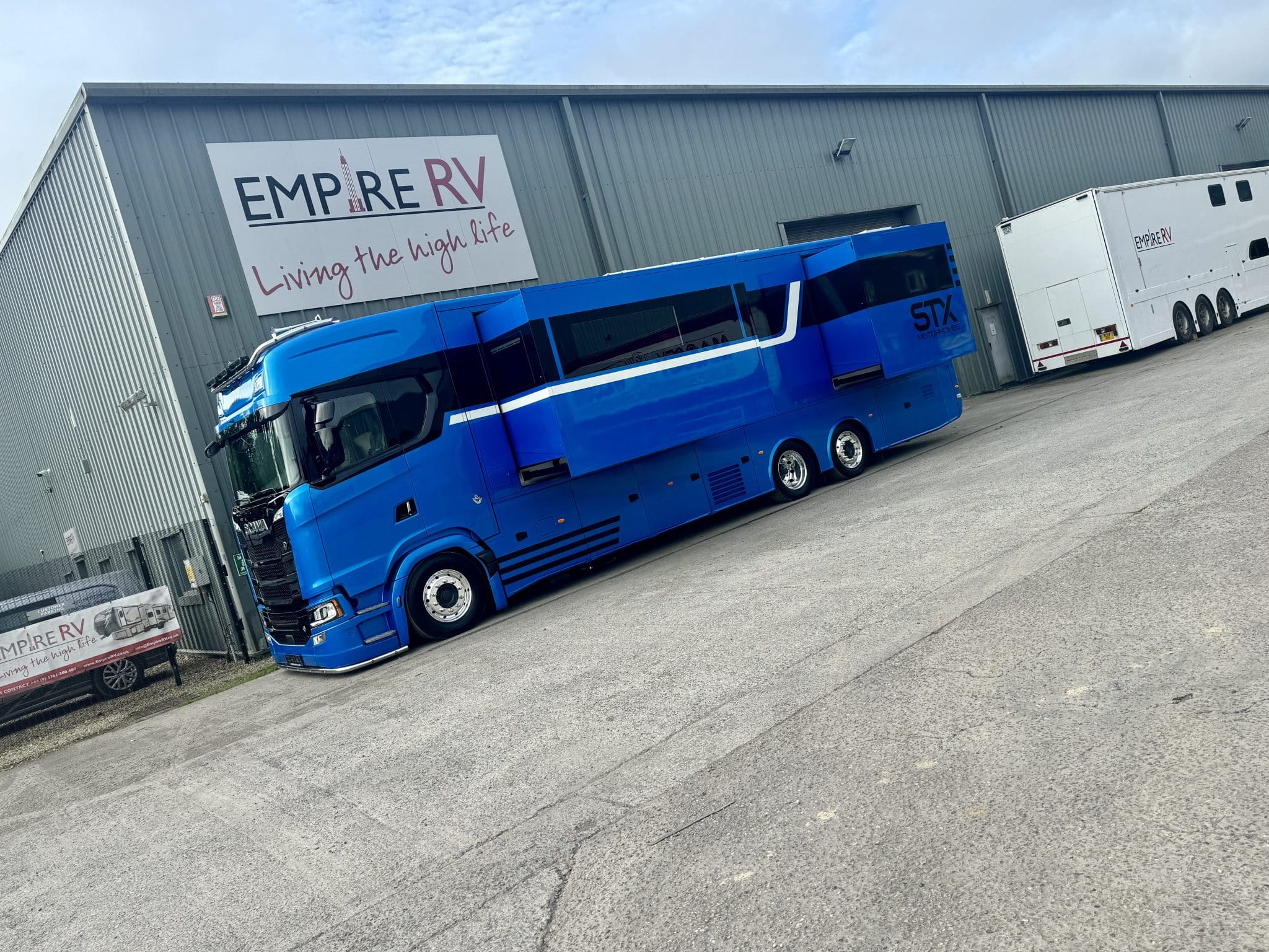 Here we have a beautiful 4 Pop Out STX Motorhome built on a Scania 770 Chassis and finished with a eye catching Alpine Blue exterior. This prestige STX Motorhome offers you a very versatile floorplan as it is one of only two STX Motorhomes built with bunks thus making it an 8 berth with a high end luxurious finish and is in stock ready to go.