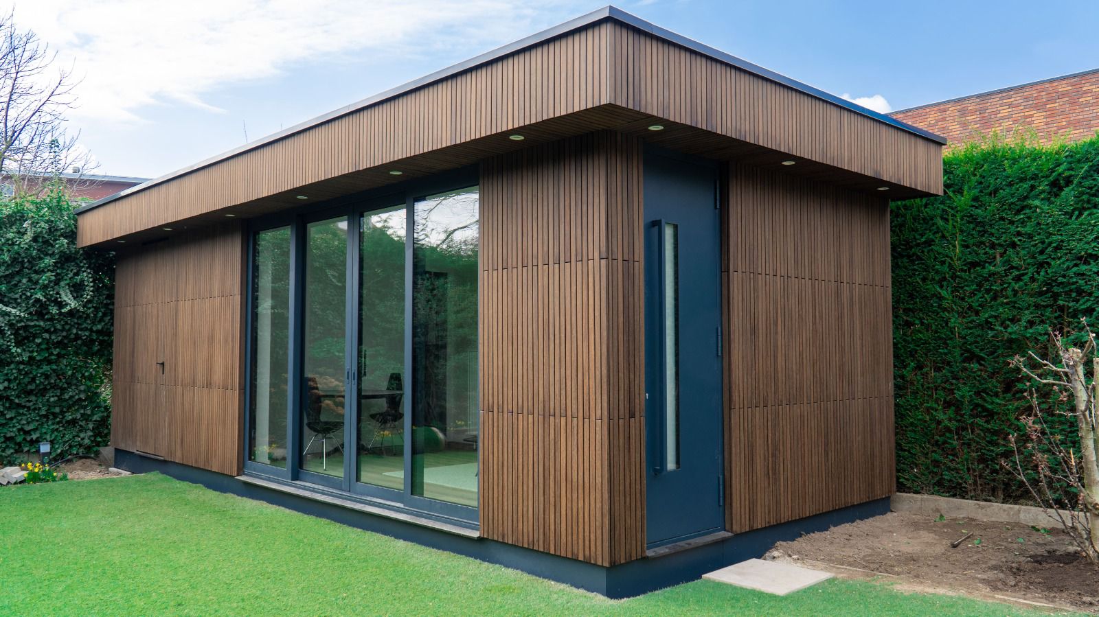 A sleek, warm wooden façade
