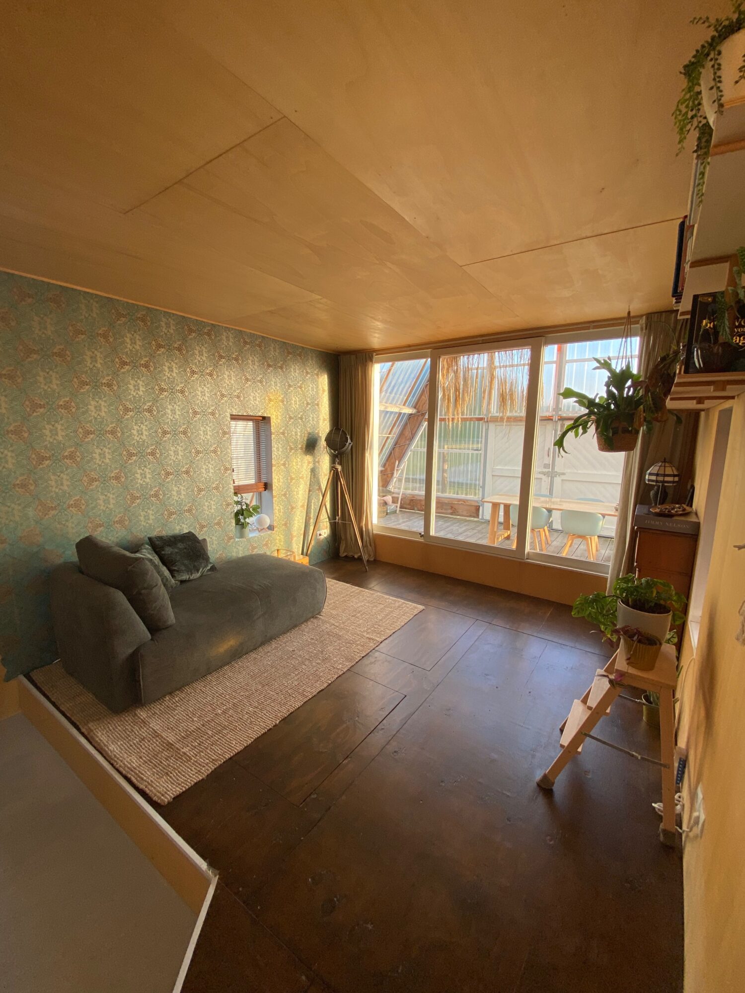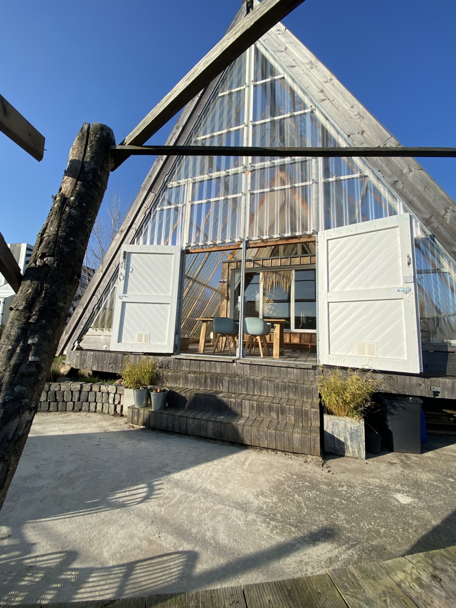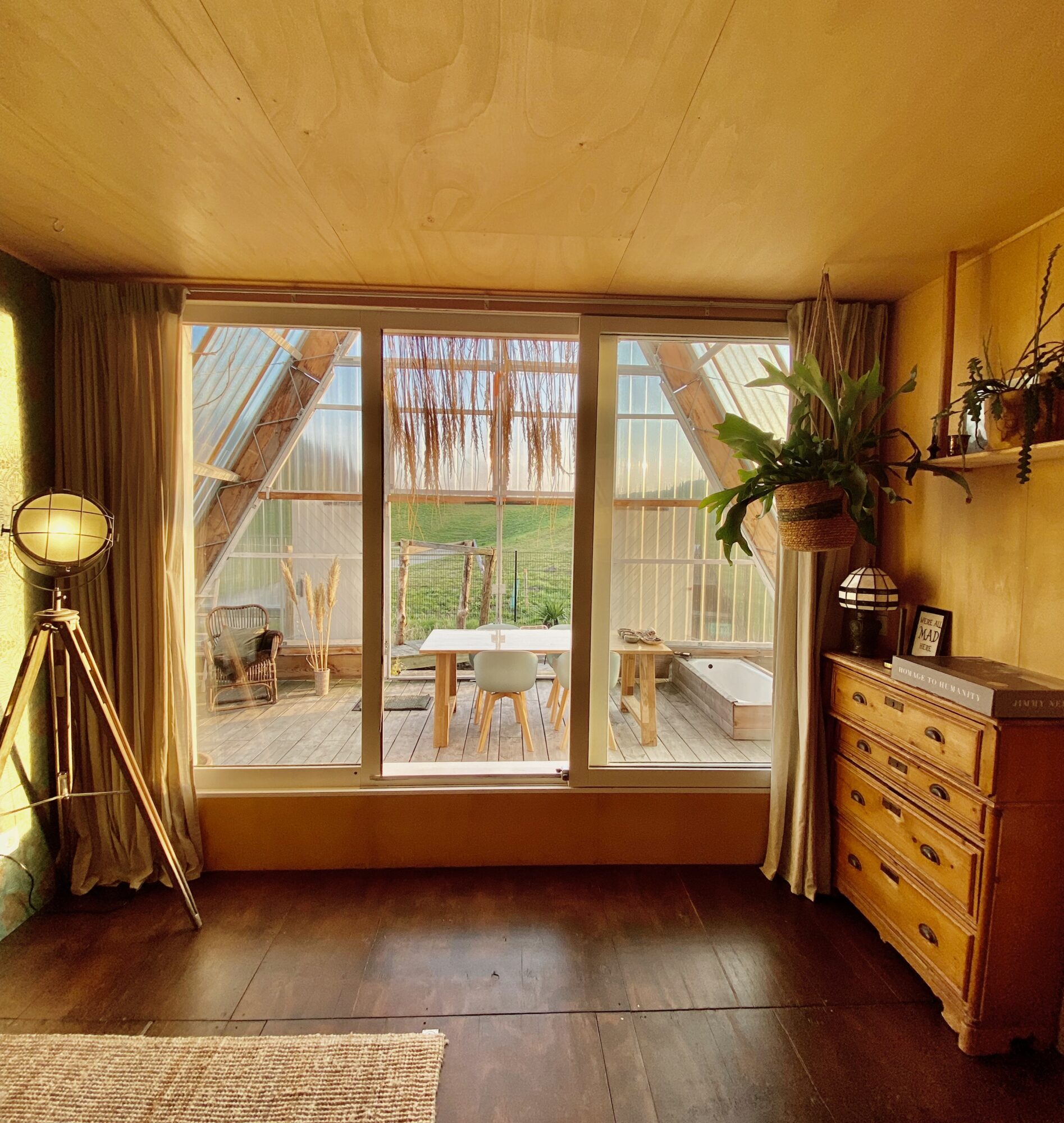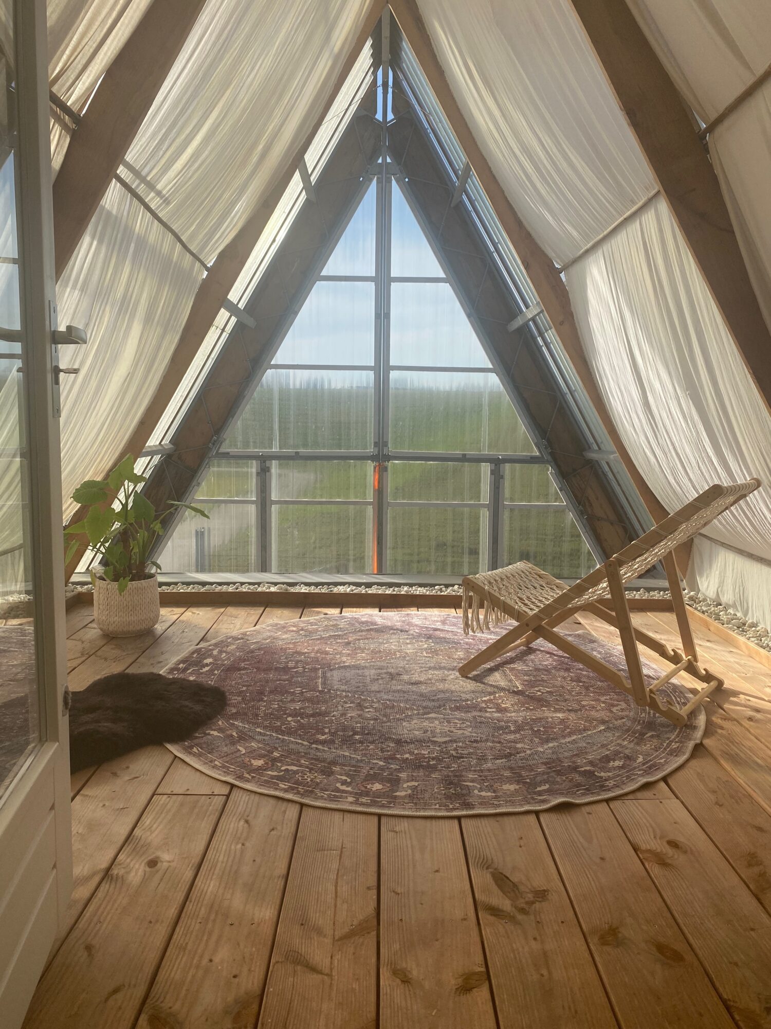 A spacious indoor balcony area within the greenhouse, shaded by cotton sun cloths