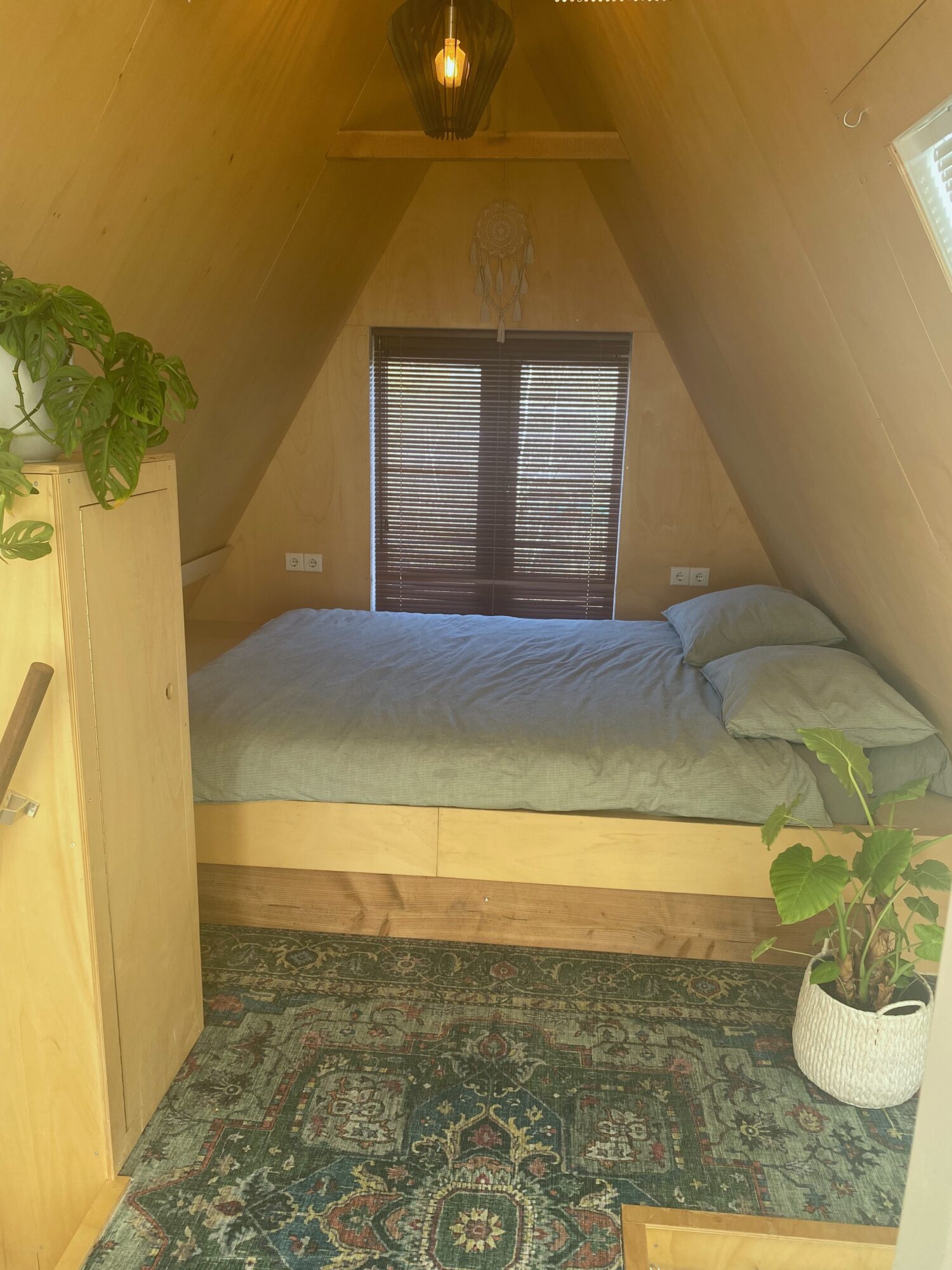 A cozy bedroom with a built-in double bed (160×200 cm), surrounded by and underneath storage