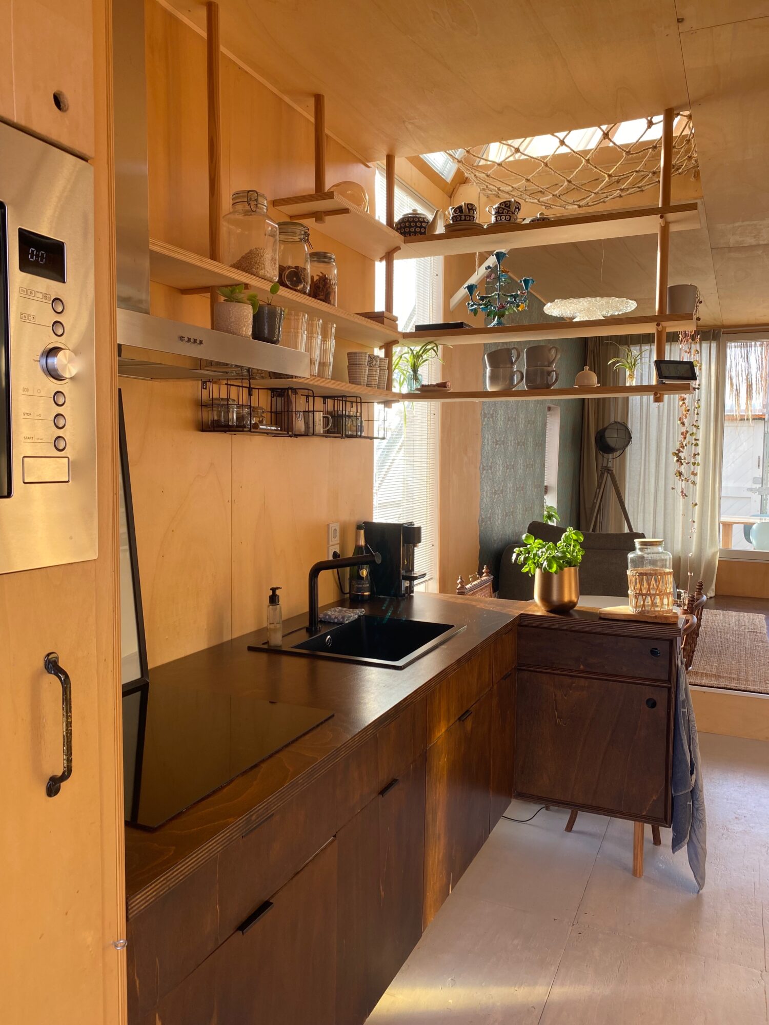 Next to the kitchen is a built-in dining table, and toward the rear is the living room, slightly elevated for additional underfloor storage. As of May 2025, the living space is equipped with a brand-new LG air conditioning unit (heating & cooling).