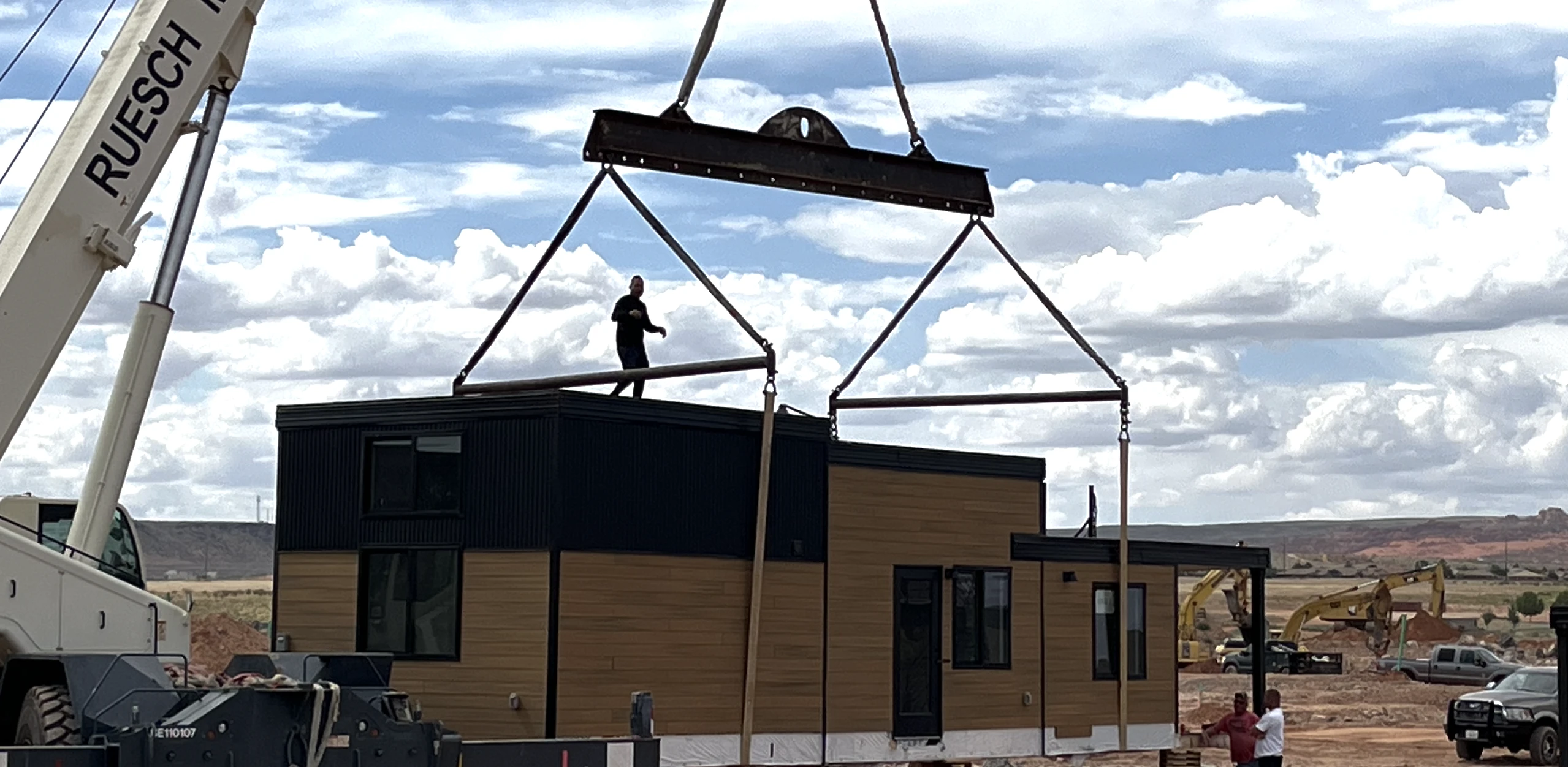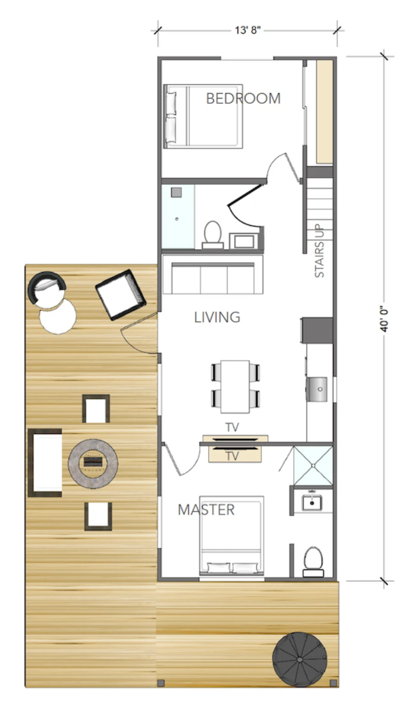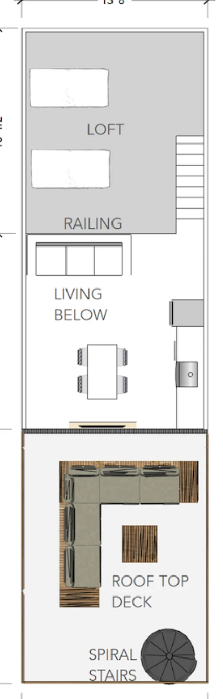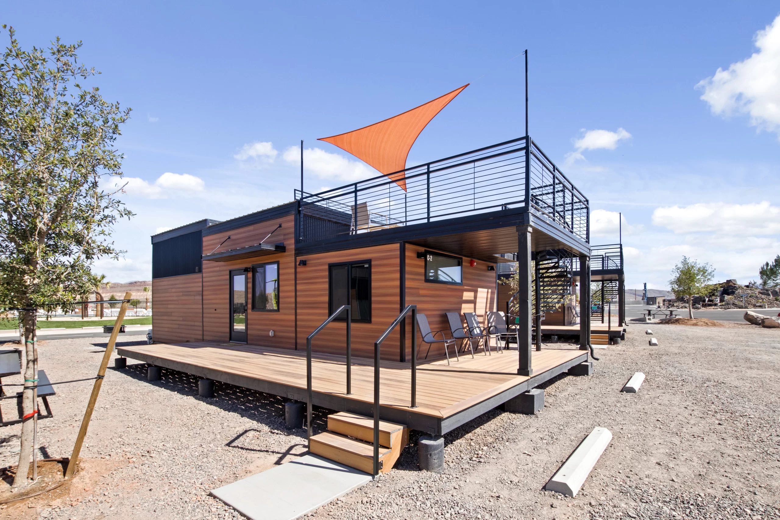 This modular unit has A LOT packed into it!  2 bedrooms, 2 bathrooms, a loft and a rooftop deck – all in a single modular unit.