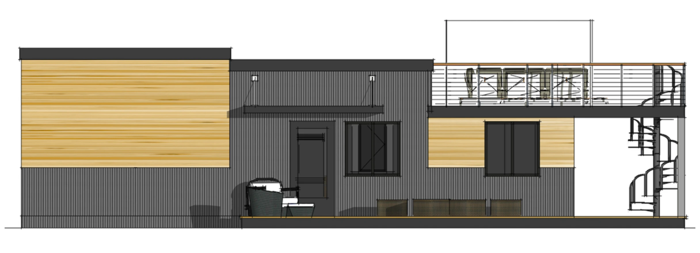 1. Exterior Siding: Combination of 26-gauge corrugated metal siding and WPC siding as shown in the renderings.